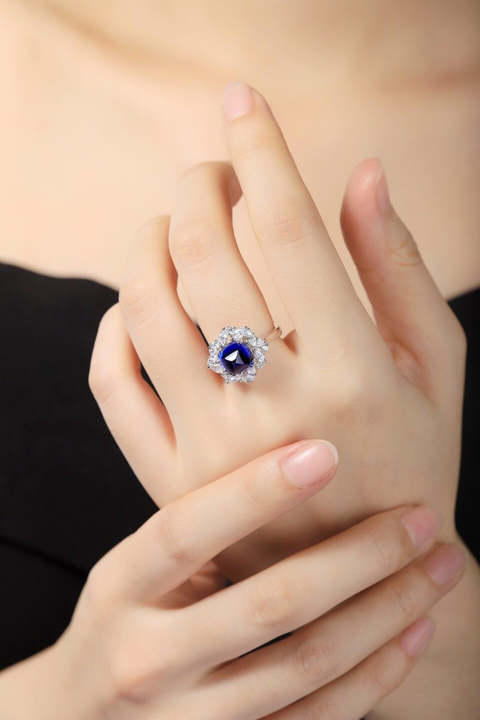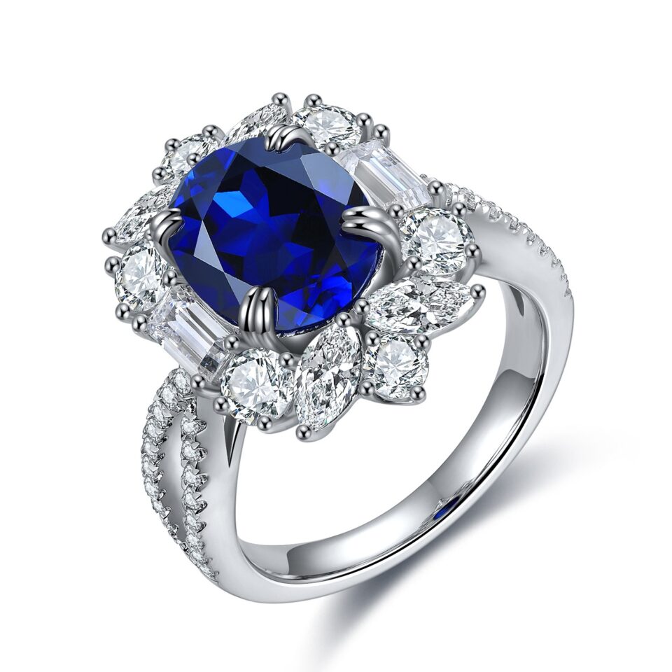 2.22-Carat Cushion-Cut Lab-Grown Sapphire of Diamond Simulants Gemstone Sterling Silver Ring