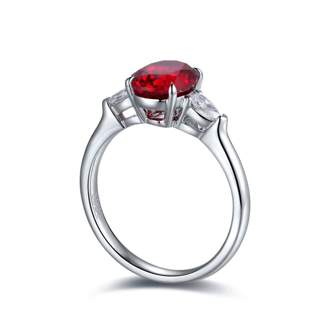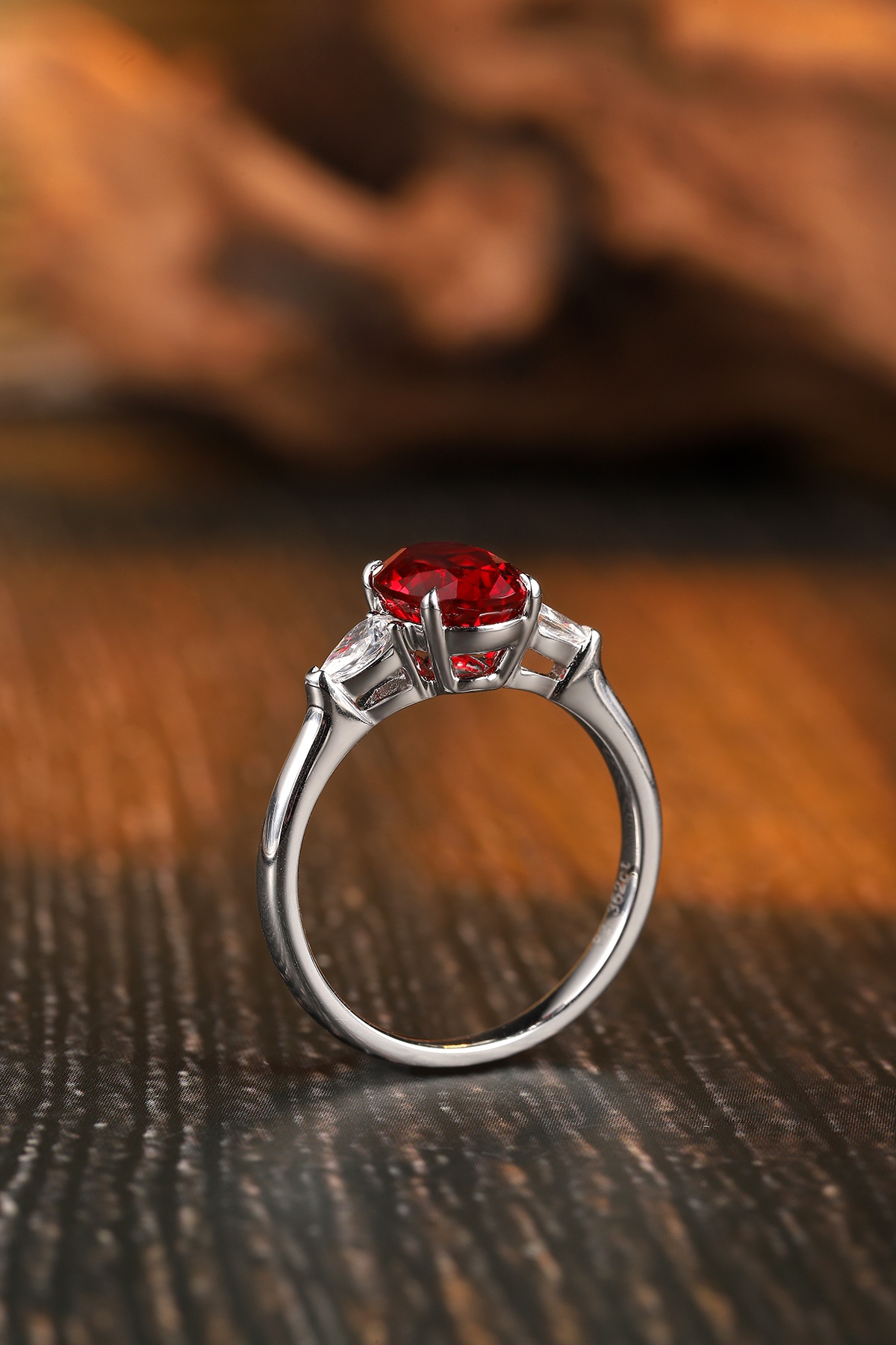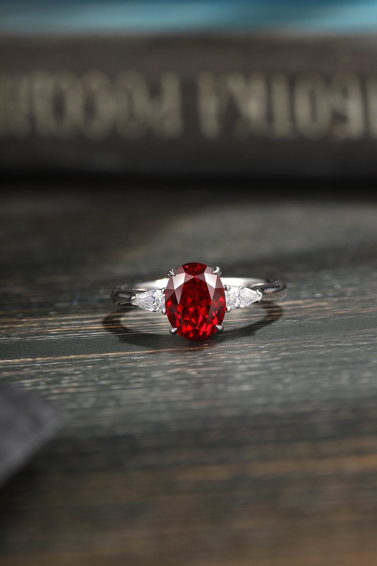 This timeless design showcases a vivid lab-grown ruby, ethically produced to ensure premium-grade color saturation and clarity. The center stone’s oval cut enhances its depth and brilliance, while the flanking AAAAA cubic zirconia—serving as realistic diamond simulants—add sparkle and symmetry to the piece. The smooth Sterling Silver band offers a lightweight, comfortable fit perfect for daily wear or special occasions.