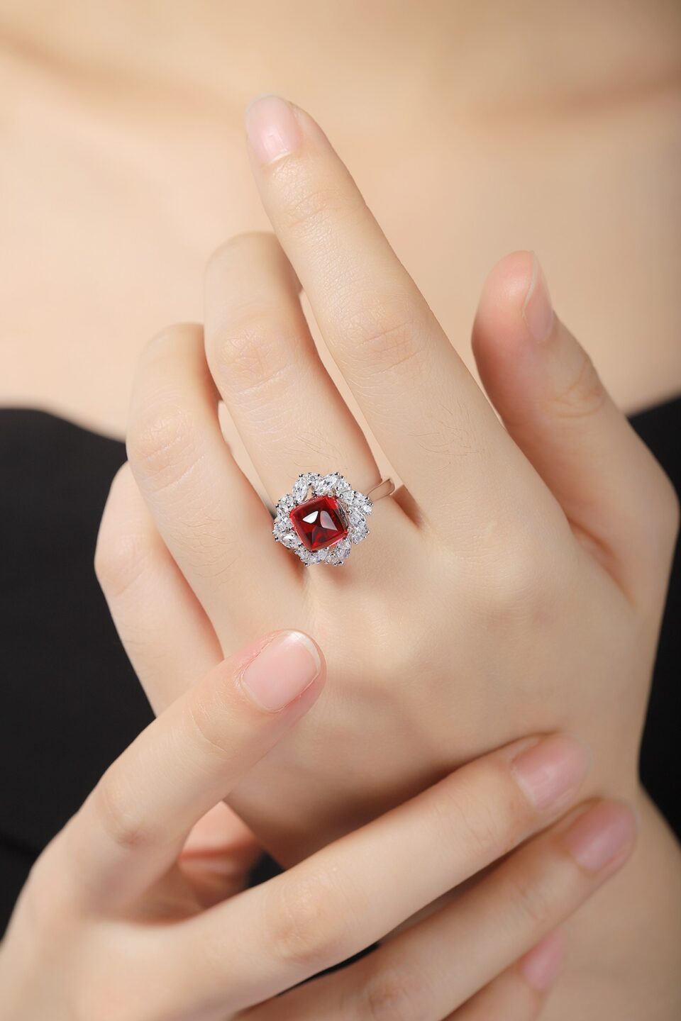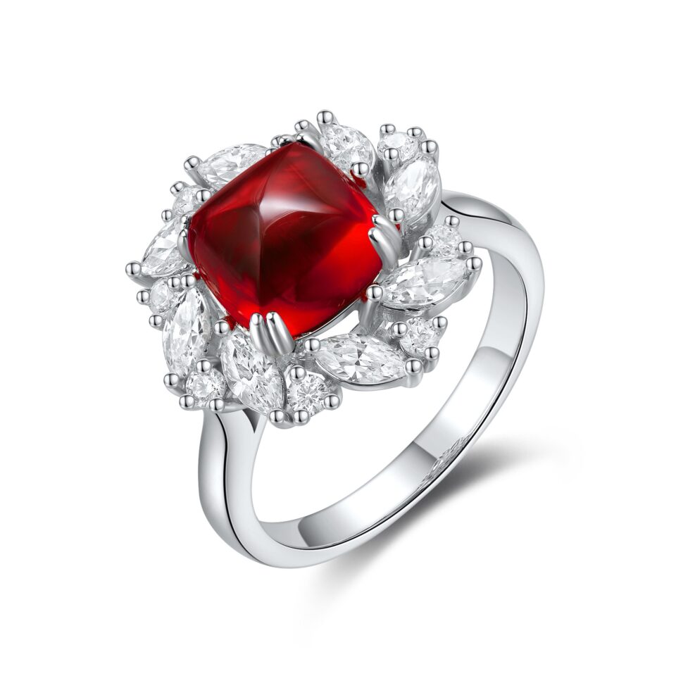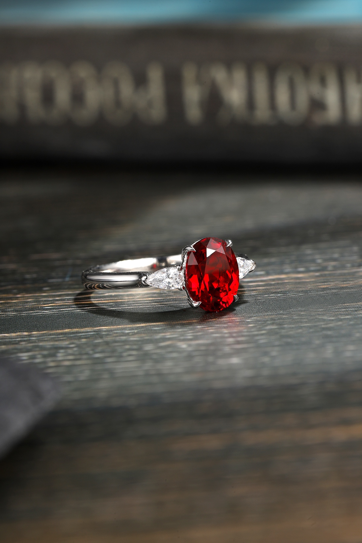 This timeless design showcases a vivid lab-grown ruby, ethically produced to ensure premium-grade color saturation and clarity. The center stone’s oval cut enhances its depth and brilliance, while the flanking AAAAA cubic zirconia—serving as realistic diamond simulants—add sparkle and symmetry to the piece. The smooth Sterling Silver band offers a lightweight, comfortable fit perfect for daily wear or special occasions.