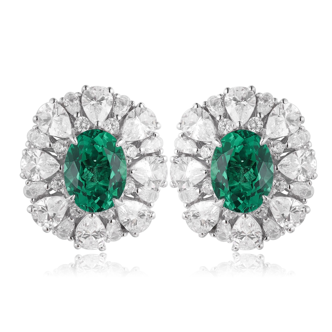 Surrounding each emerald is a magnificent halo of brilliant-cut diamond simulants, arranged in a radiating pattern reminiscent of a blooming flower or starburst. These AAAAA cubic zirconia stones offer dazzling brilliance and fire, perfectly simulating natural diamonds while remaining eco-friendly and affordable.