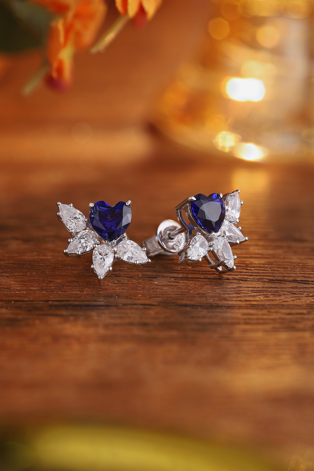 These Lab-Grown Blue Sapphire of Diamond Simulants Gemstone Sterling Silver Earrings embody romantic grace and refined beauty. The heart-cut sapphires gleam with a deep royal blue, symbolizing loyalty and wisdom. Each sapphire is adorned with carefully arranged marquise-cut AAAAA cubic zirconia diamond simulants, forming a radiant, wing-like pattern that evokes motion and charm. Set in polished Sterling Silver, these earrings seamlessly combine softness with contemporary style.