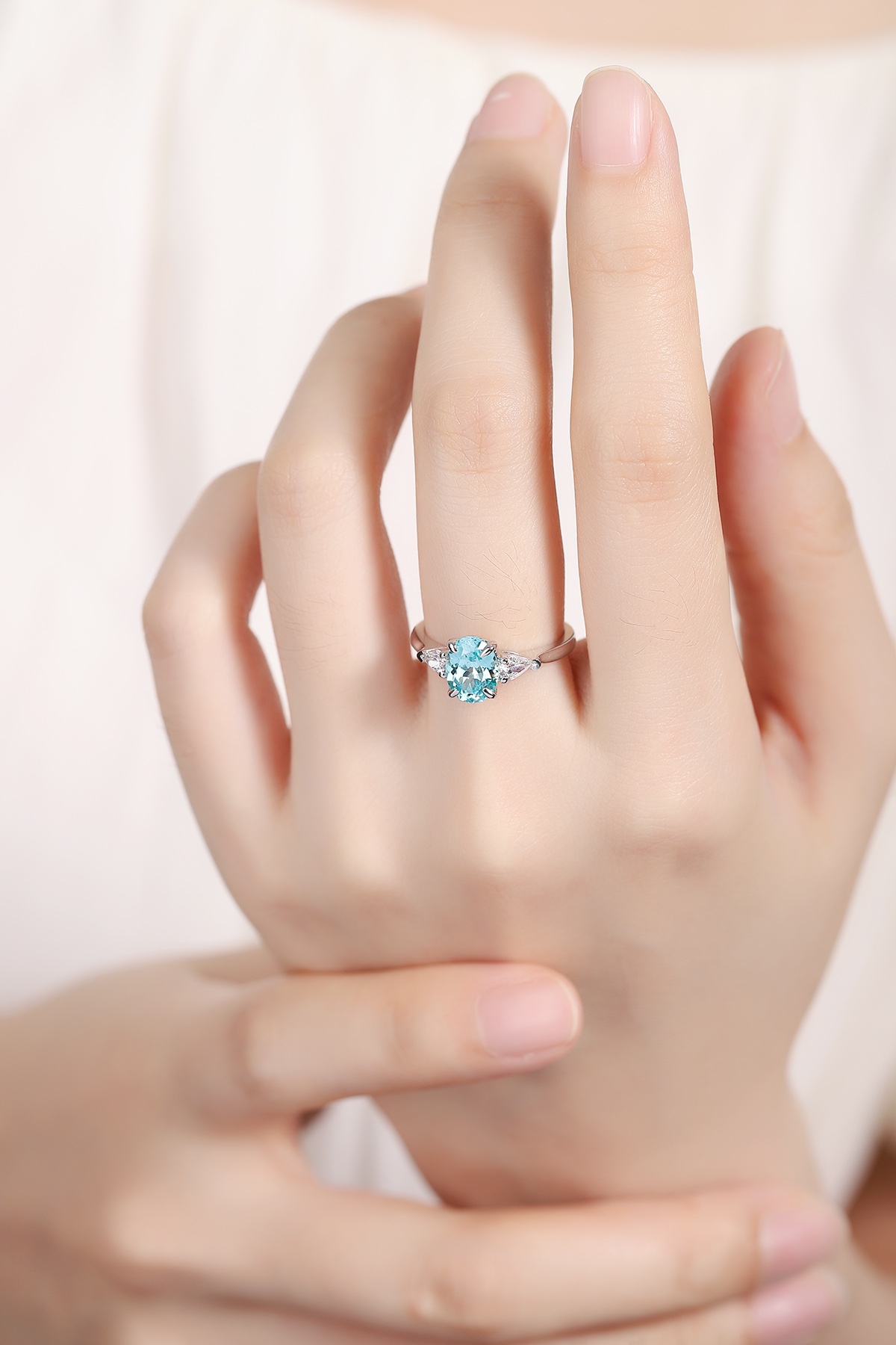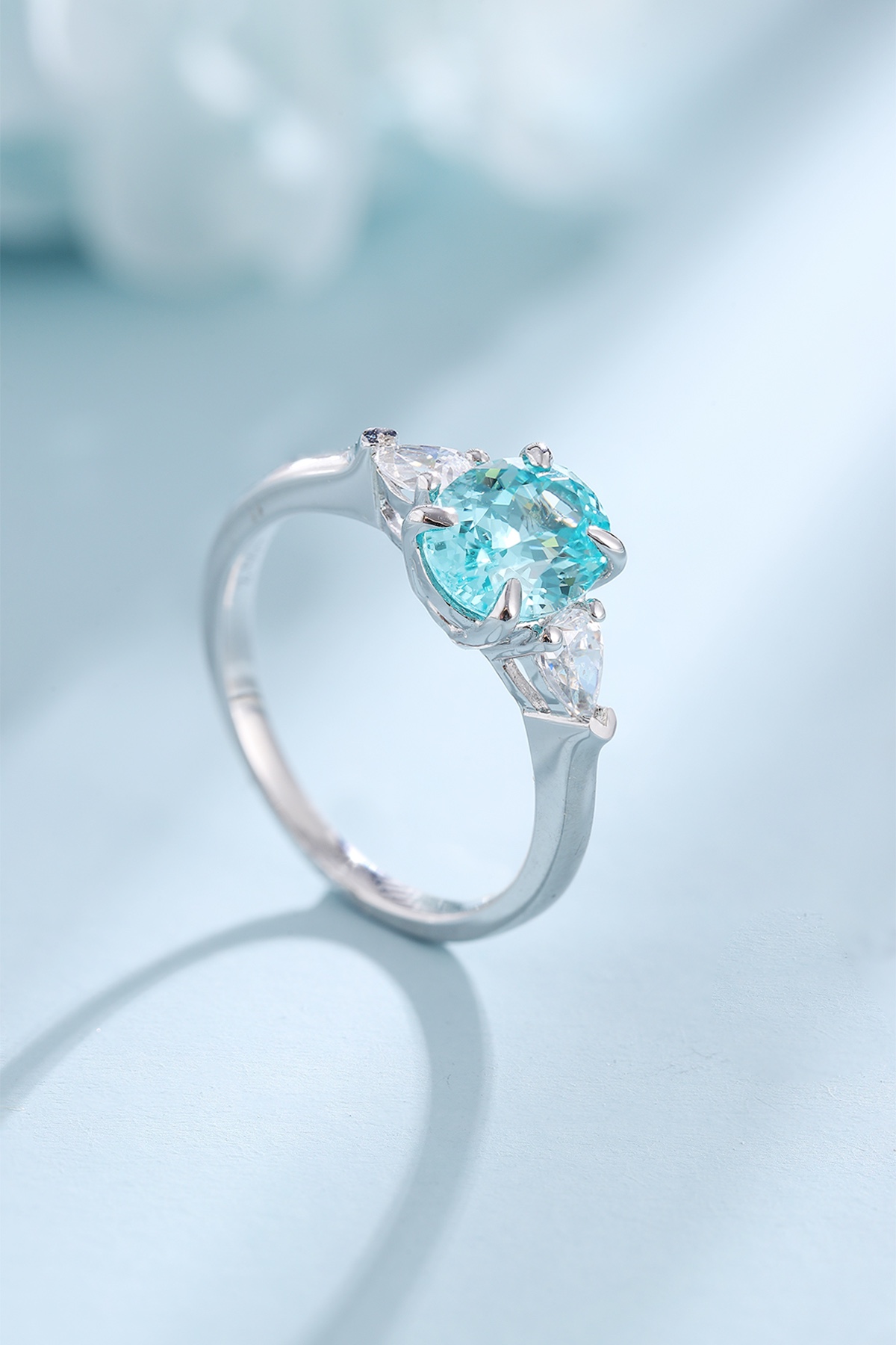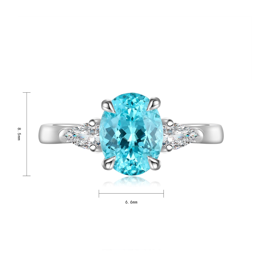 This Lab-Grown Paraiba of Diamond Simulants Gemstone Sterling Silver Ring showcases an exquisite oval-cut center stone, prized for its classic silhouette and optimal brilliance. The gemstone is lab-grown to premium standards, offering rich color and ethical sourcing. Complementing the main stone are high-quality AAAAA cubic zirconia diamond simulants, creating a refined sparkle on either side. Set in sleek Sterling Silver, this ring is lightweight, graceful, and endlessly wearable.