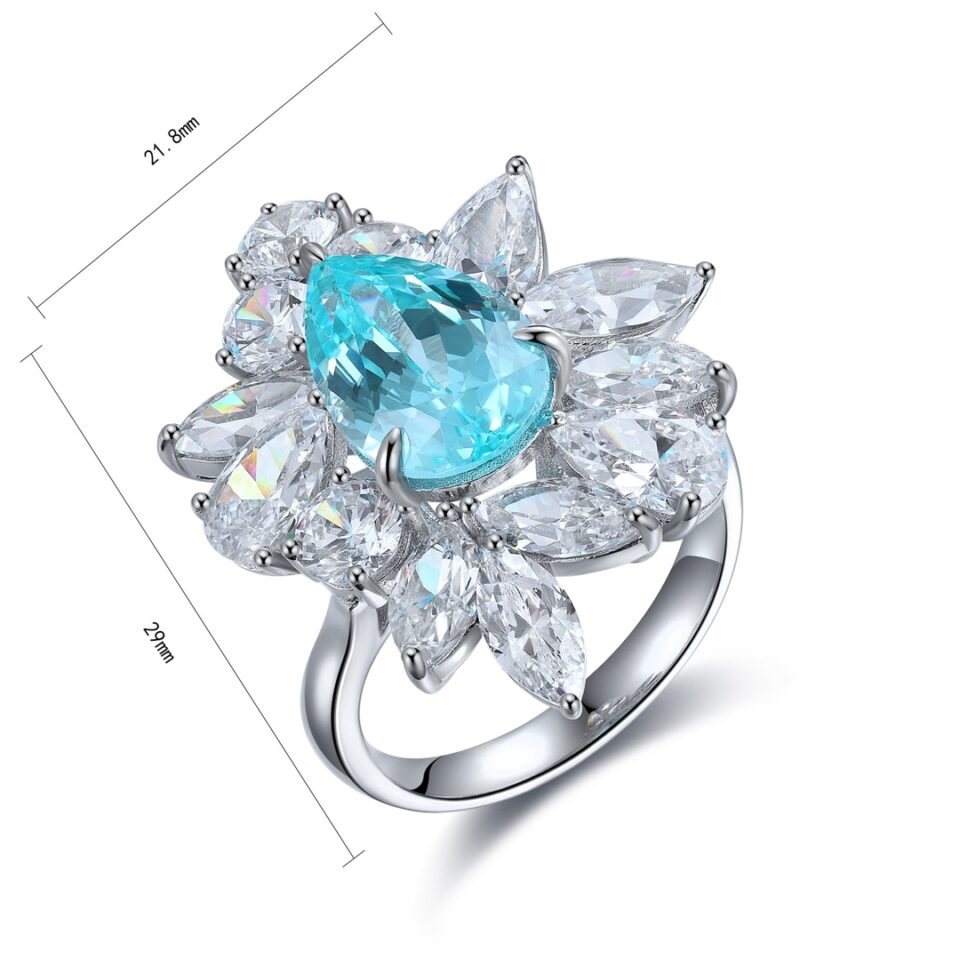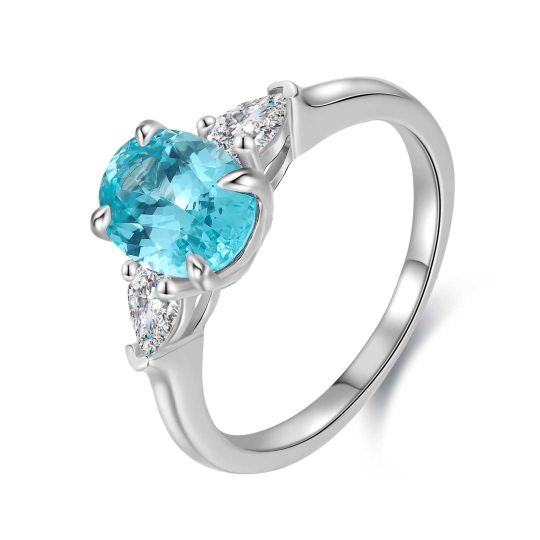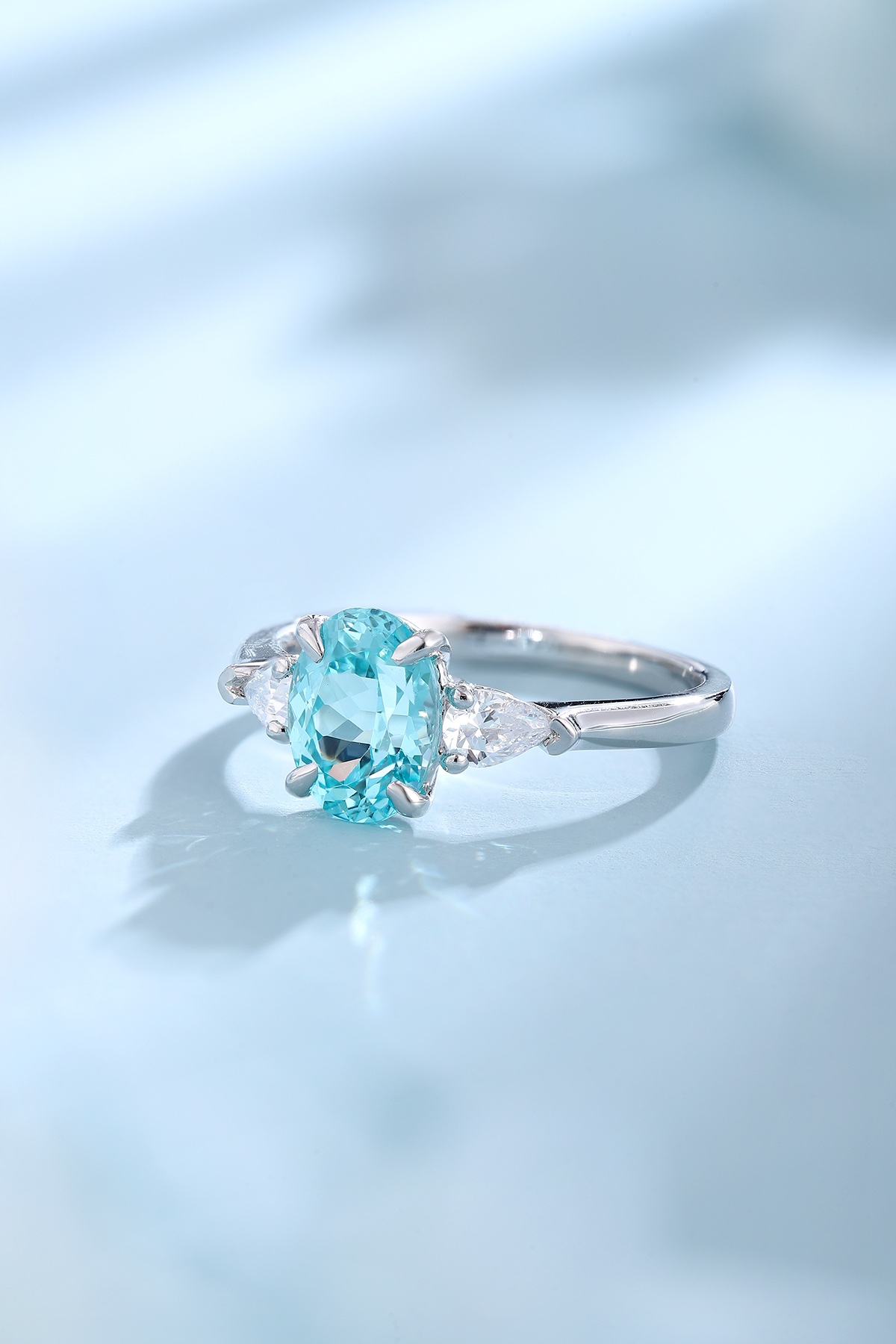 This Lab-Grown Paraiba of Diamond Simulants Gemstone Sterling Silver Ring showcases an exquisite oval-cut center stone, prized for its classic silhouette and optimal brilliance. The gemstone is lab-grown to premium standards, offering rich color and ethical sourcing. Complementing the main stone are high-quality AAAAA cubic zirconia diamond simulants, creating a refined sparkle on either side. Set in sleek Sterling Silver, this ring is lightweight, graceful, and endlessly wearable.