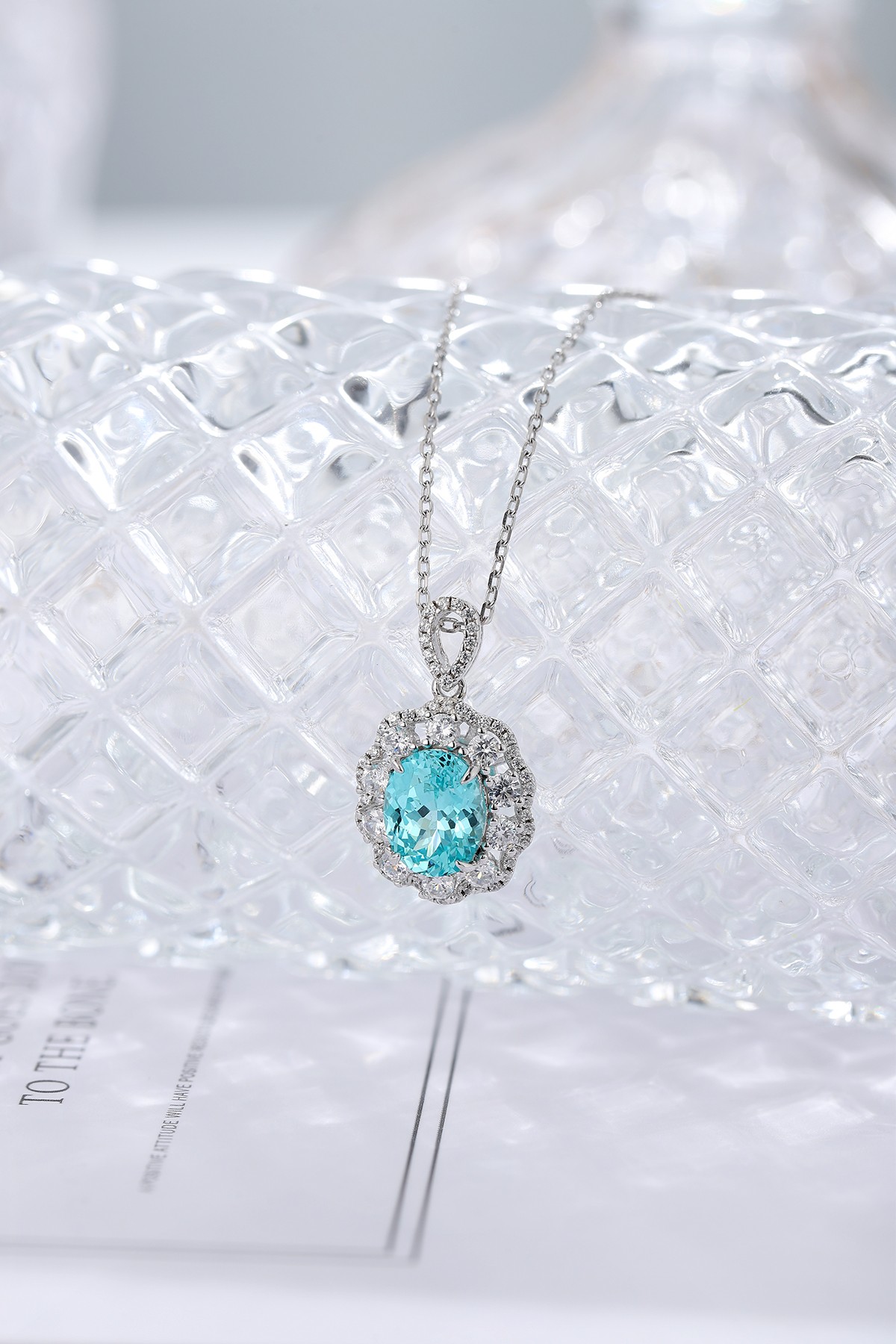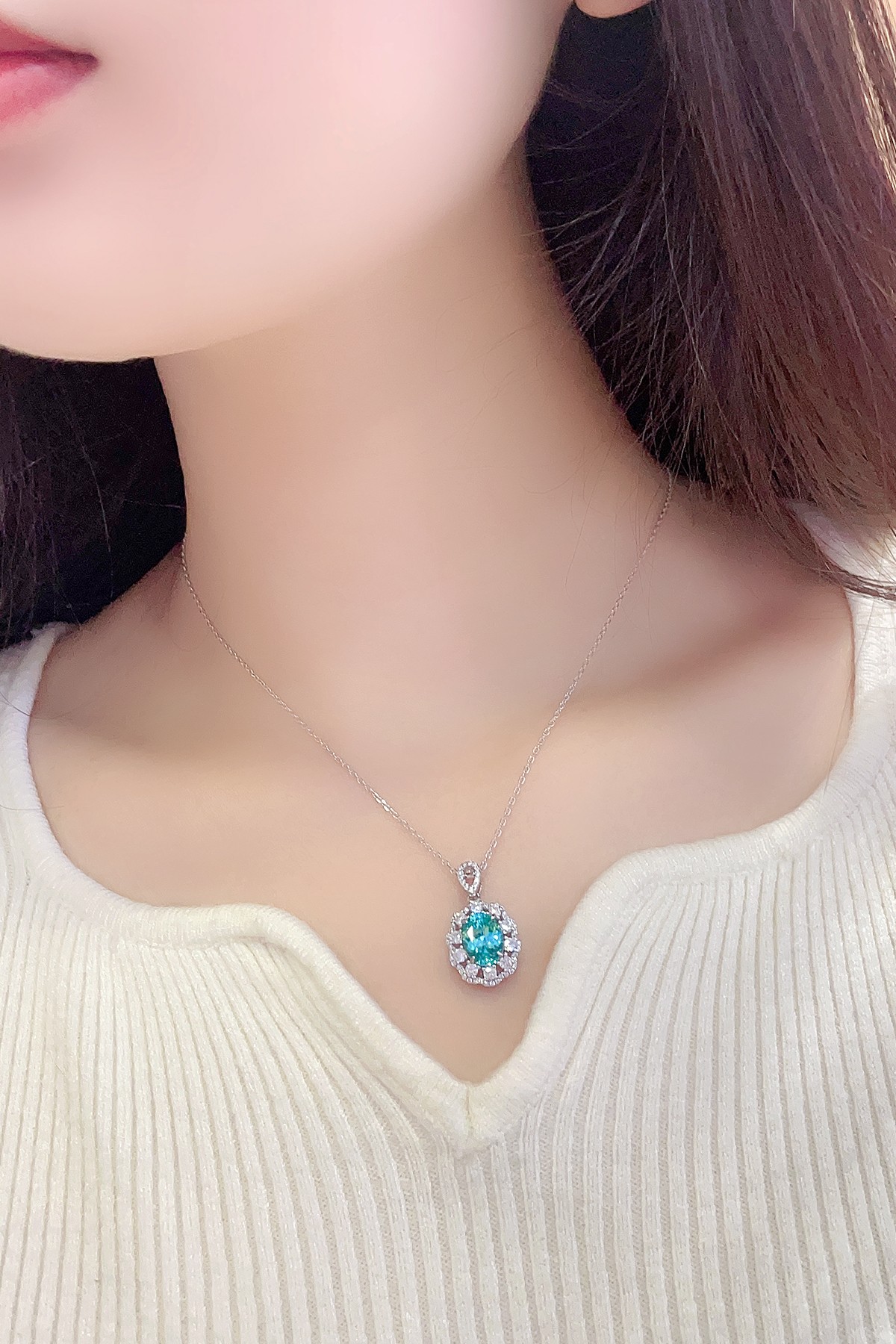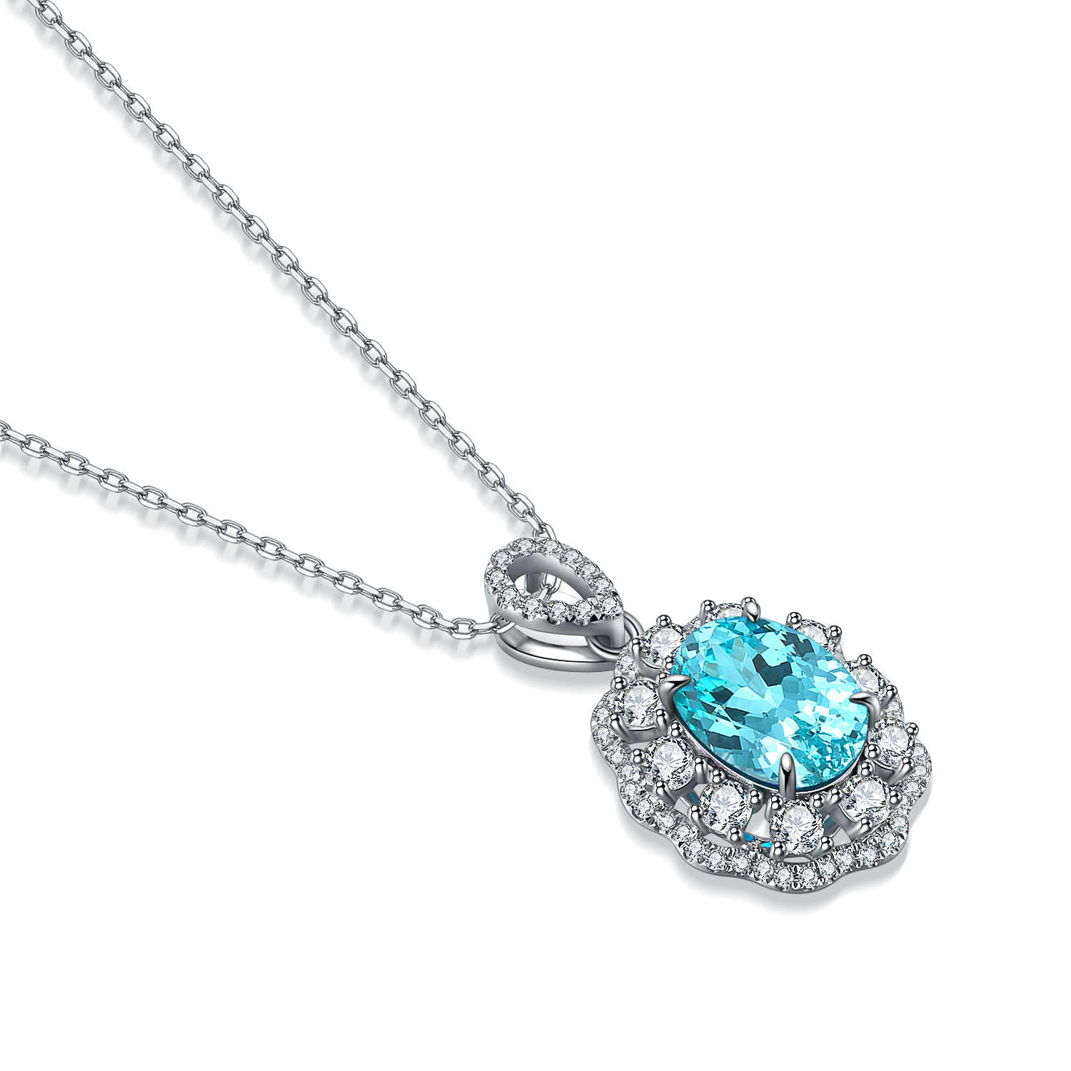 This exquisite Lab-Grown Paraiba Gemstone Necklace offers a sophisticated blend of classic charm and contemporary beauty. The mesmerizing aqua-blue oval centerpiece sparkles gracefully, framed by a delicate halo of brilliant-cut diamond simulants arranged in a soft scalloped motif for added romance.