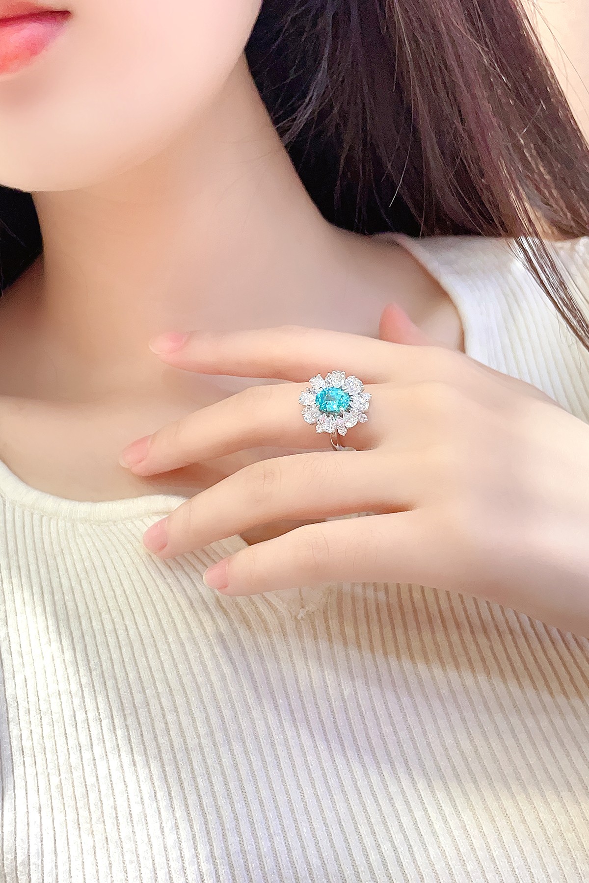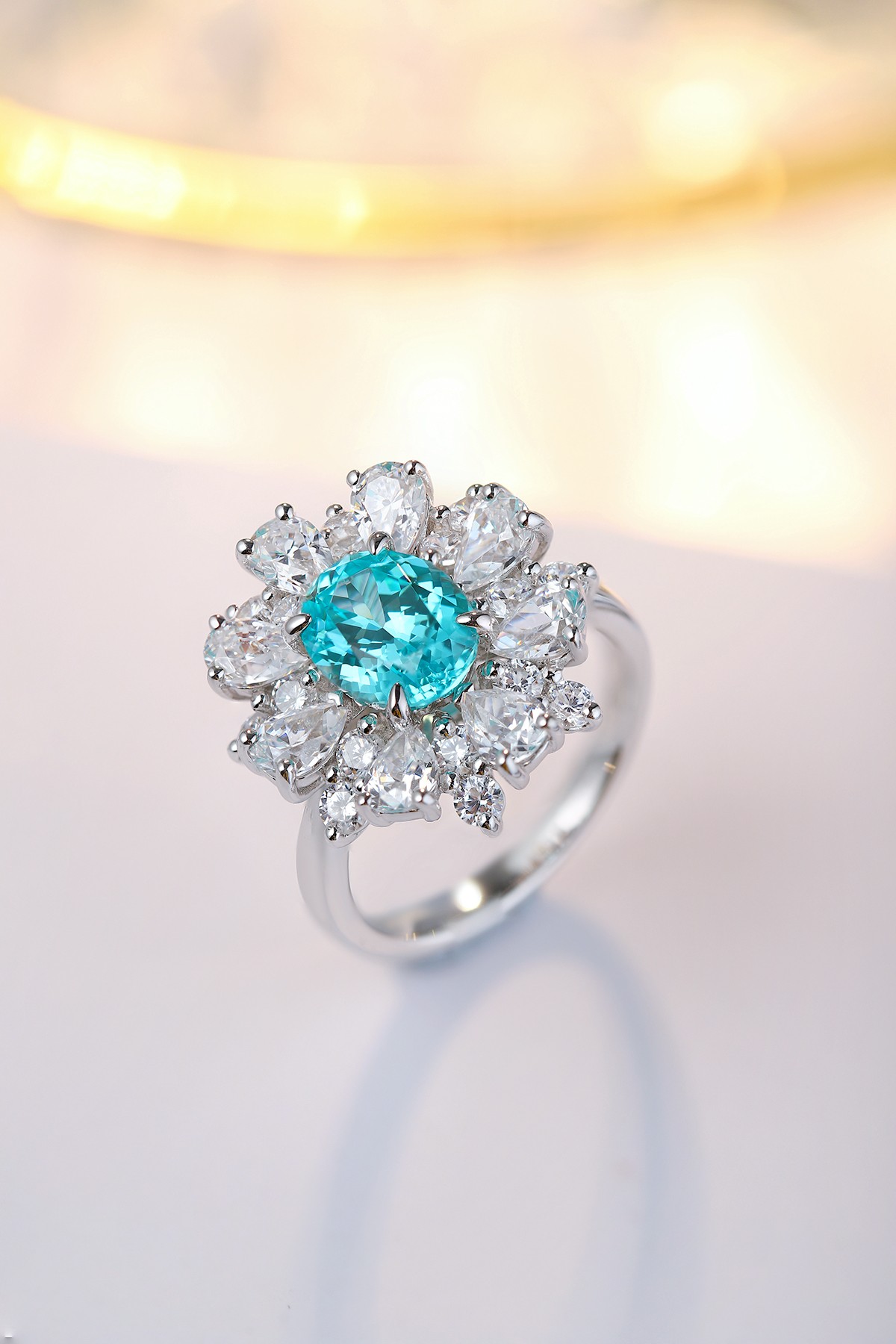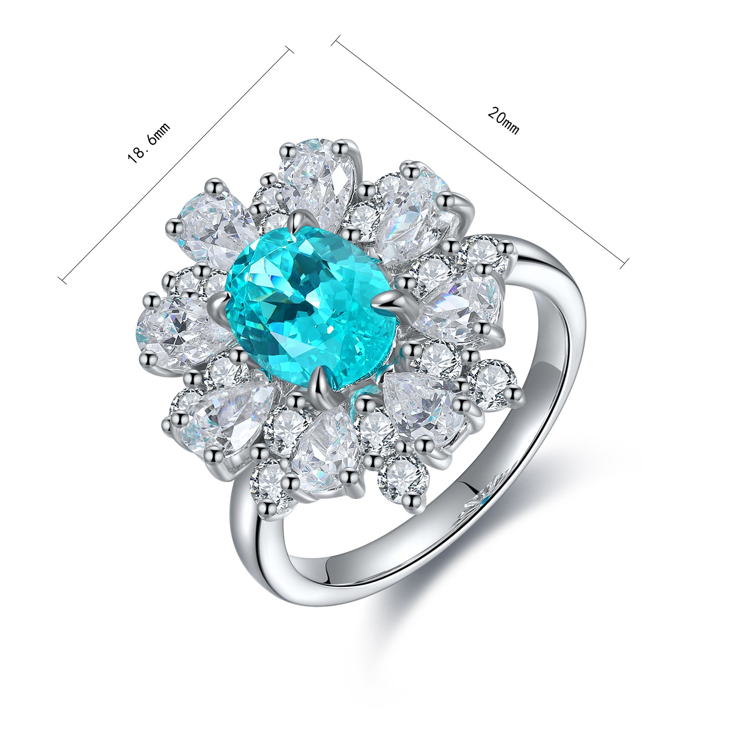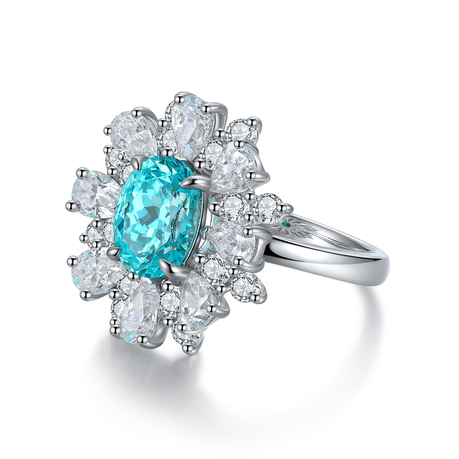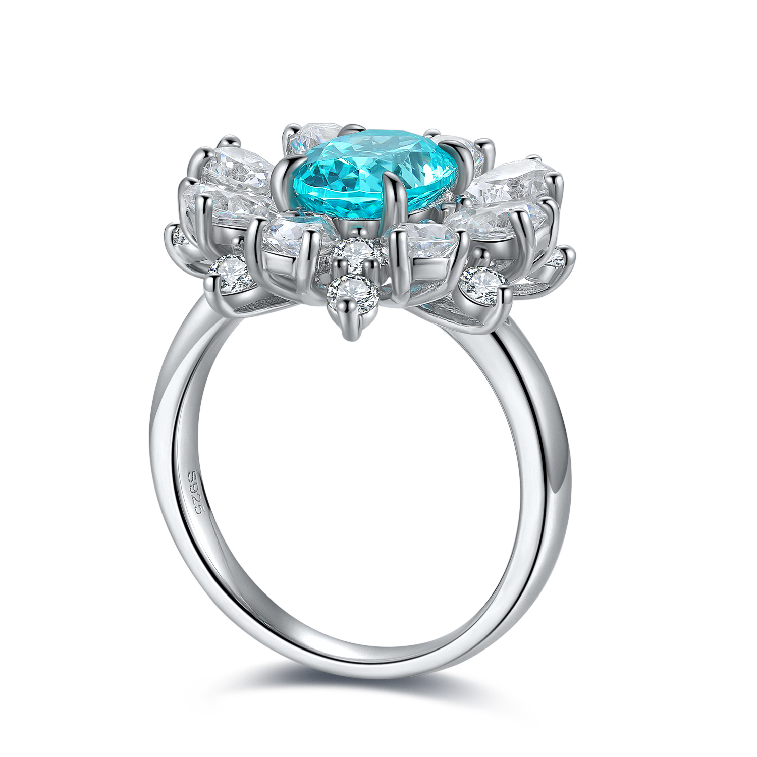 This Lab-Grown Paraiba of Diamond Simulants Gemstone Sterling Silver Ring features a vivid oval-cut centerpiece crafted from premium quality lab-grown Paraiba, known for its signature ocean-blue brilliance. A layered halo of high-quality AAAAA cubic zirconia diamond simulants in marquise and round cuts surrounds the gem, creating a dimensional flower-like silhouette. Finished in polished Sterling Silver, this piece delivers luxurious elegance for both special occasions and standout everyday style.