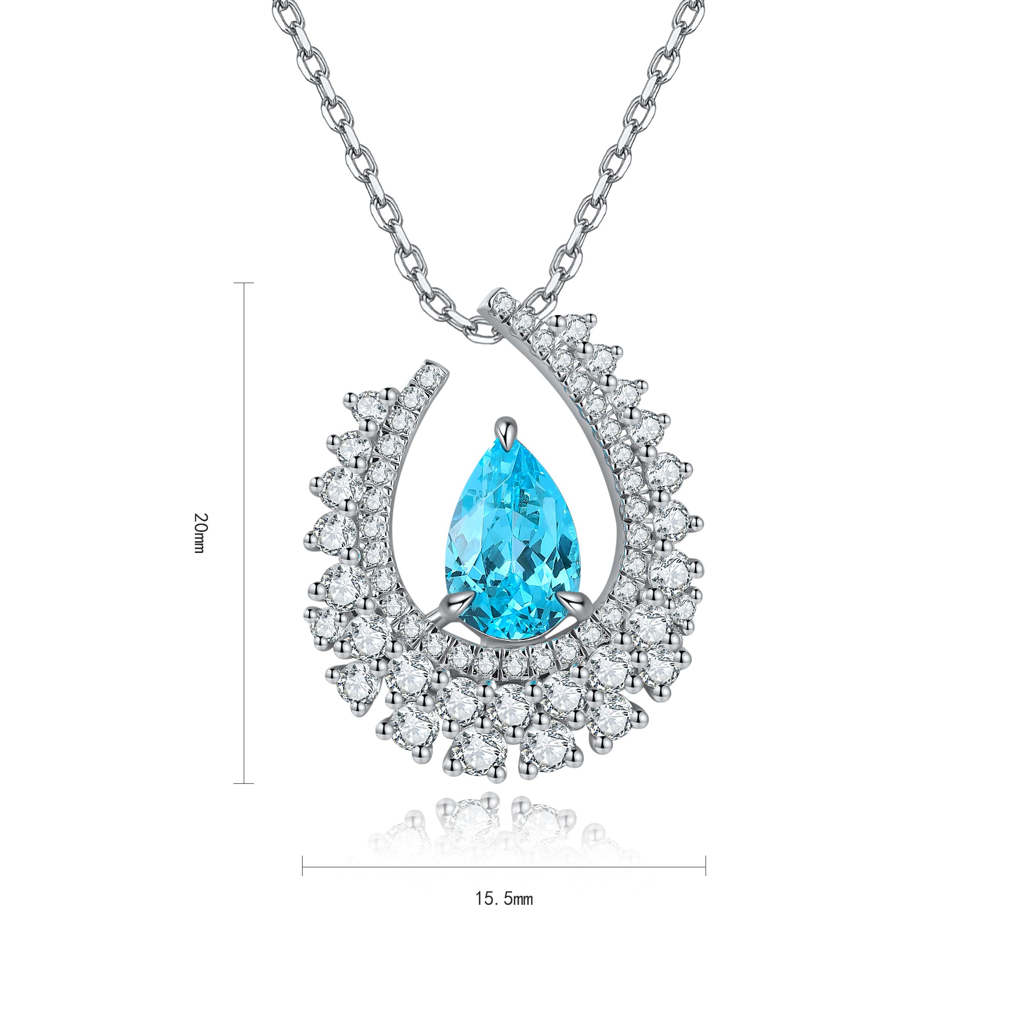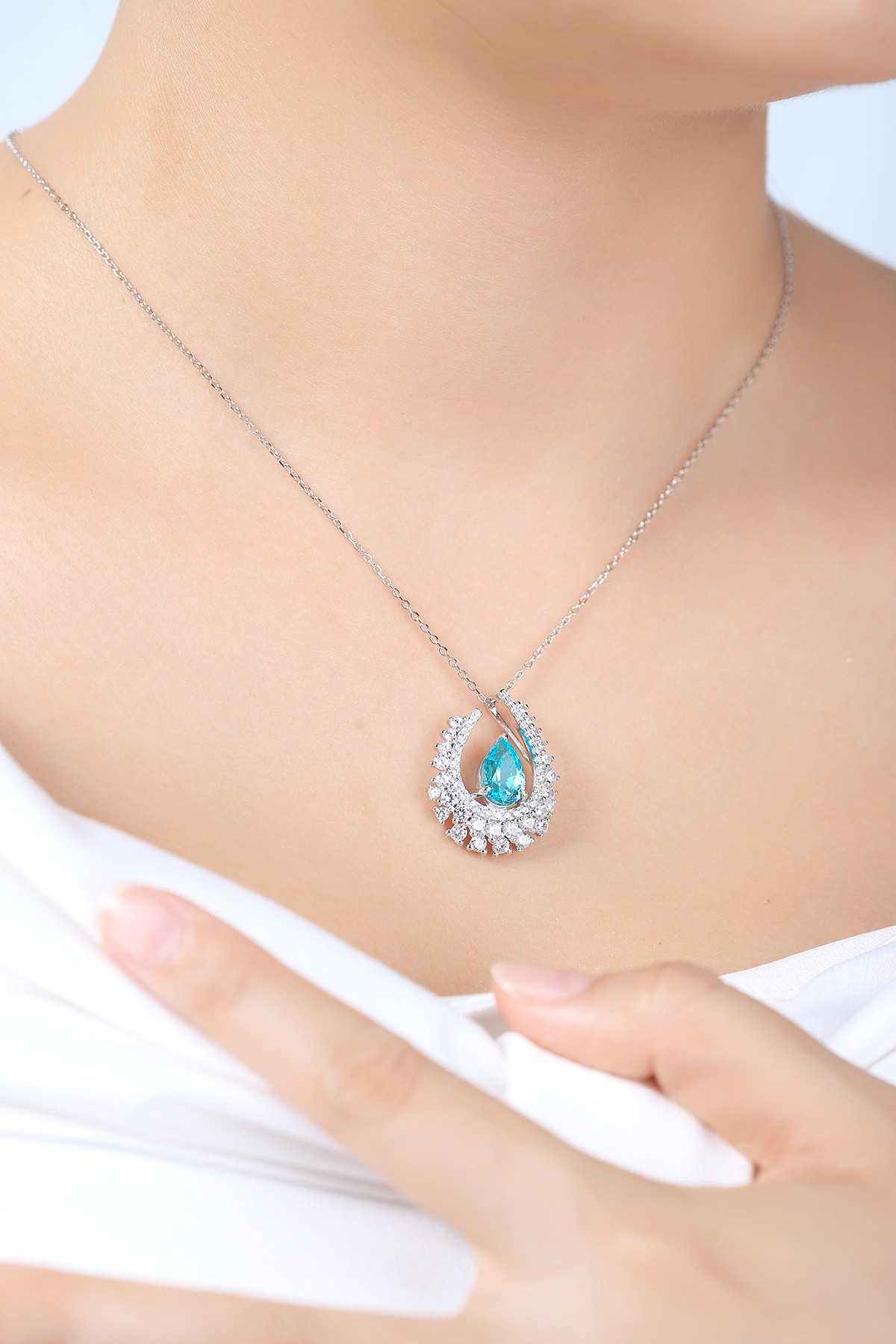 Add a touch of glamour and sophistication with this stunning Sterling Silver Necklace, showcasing a captivating 3.4-carat Pear-Cut Lab-Grown Paraiba Gemstone, gracefully surrounded by shimmering diamond simulants in an elegant crescent halo design.