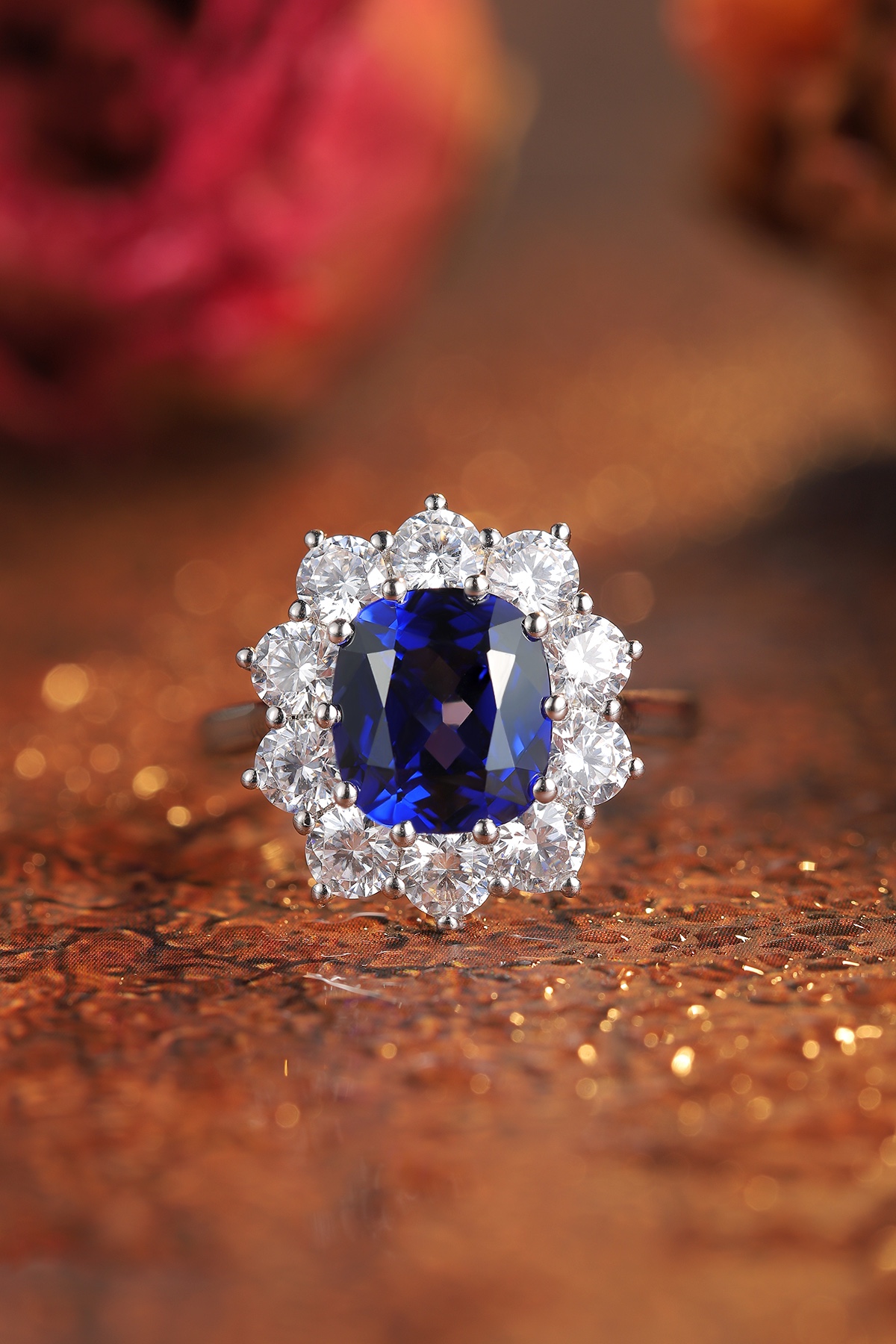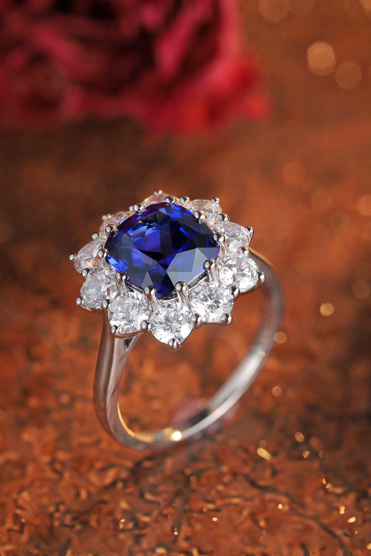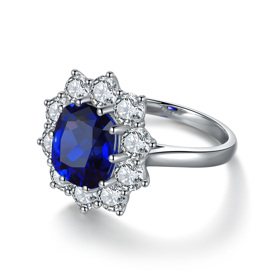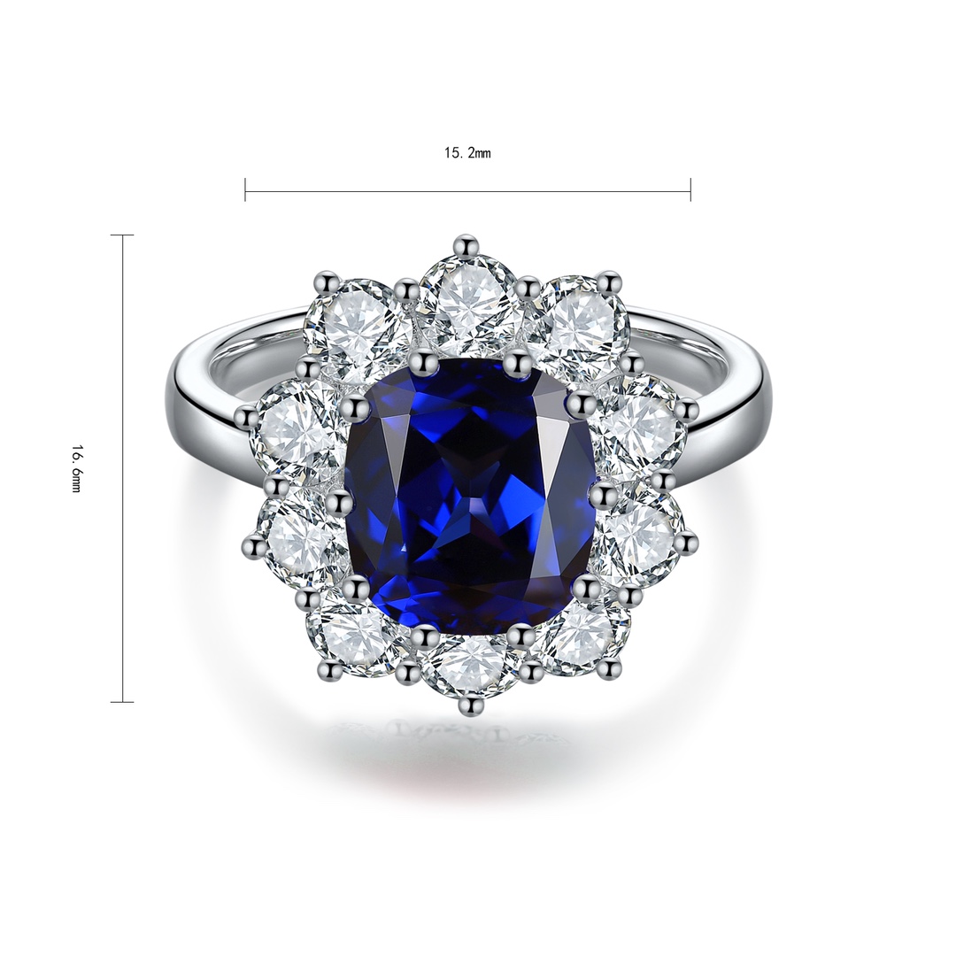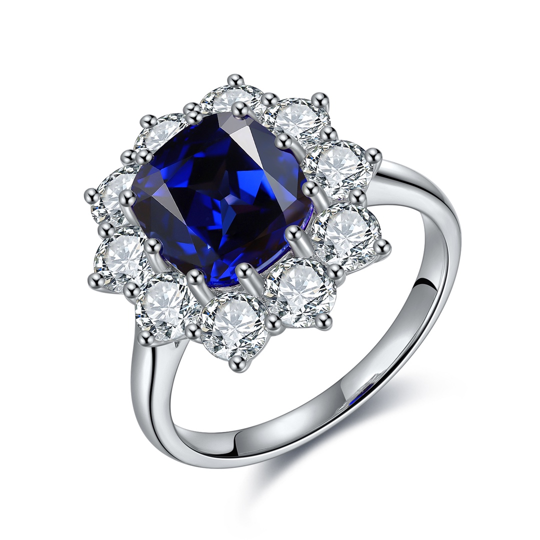 This refined Lab-Grown Sapphire of Diamond Simulants Gemstone Sterling Silver Ring is crafted around a stunning cushion-cut sapphire, lab-grown to premium quality for its saturated navy brilliance and excellent transparency. A classic halo of high-quality AAAAA cubic zirconia diamond simulants encircles the centerpiece, enhancing its glow and adding luxurious depth. The band, forged in sleek Sterling Silver, brings balance to this regal design.