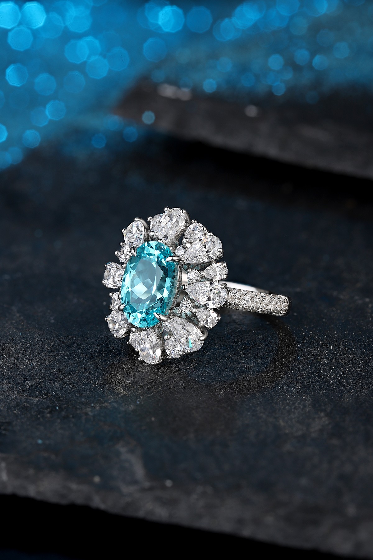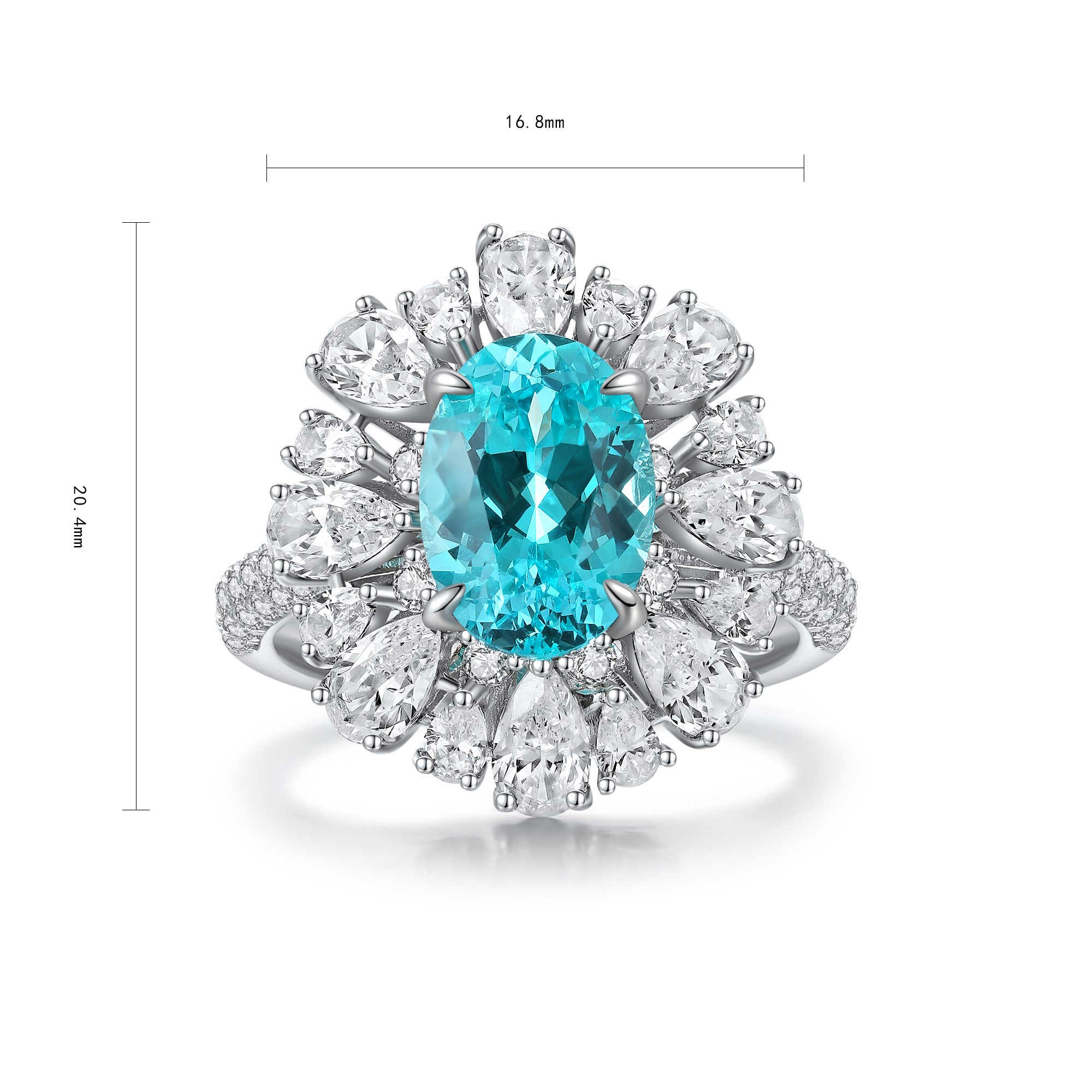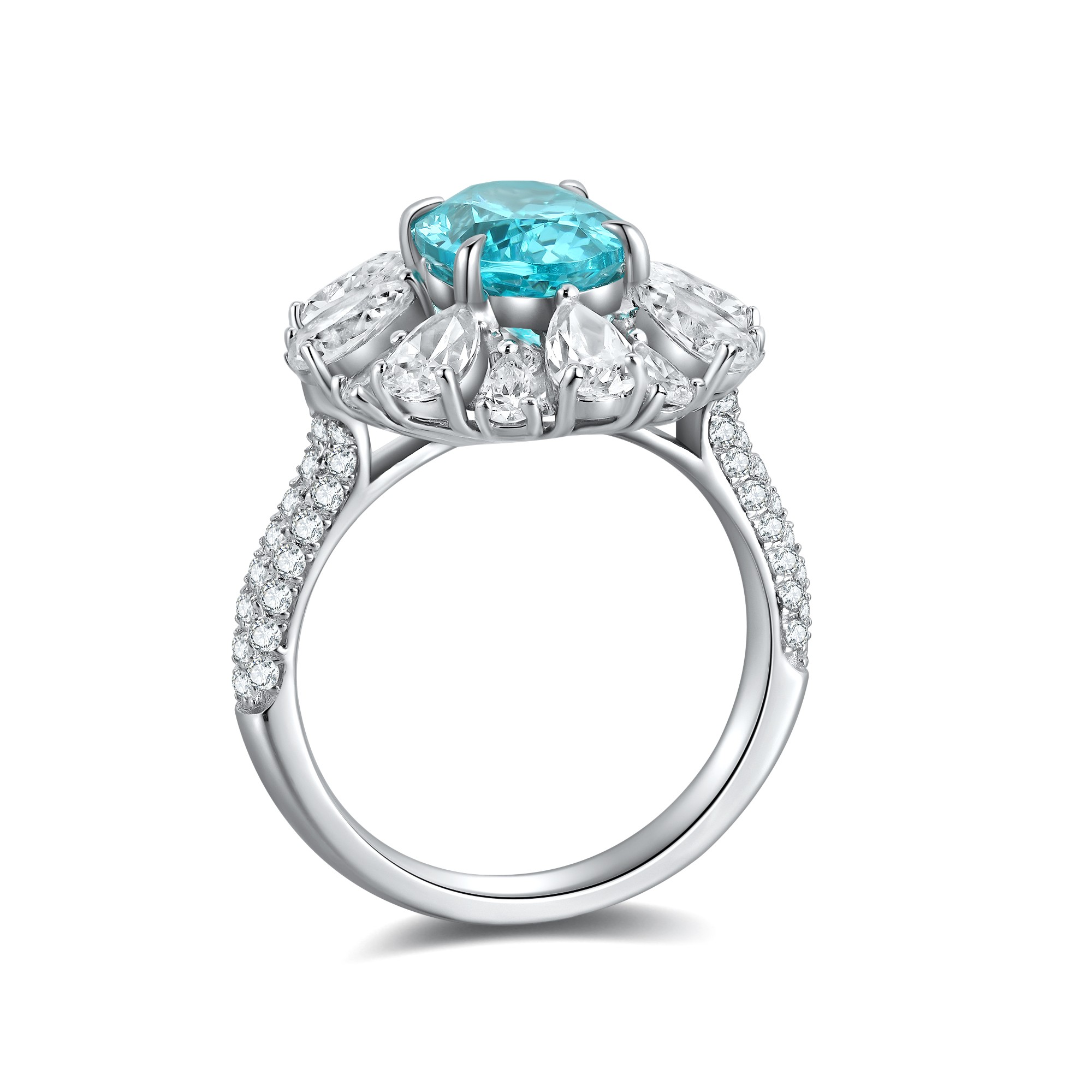 This Lab-Grown Paraiba of Diamond Simulants Gemstone Sterling Silver Ring showcases a vibrant oval-cut centerpiece made from premium quality lab-grown Paraiba, admired for its tropical ocean-blue hue. Surrounding the center gem is a radiant arrangement of high-quality AAAAA cubic zirconia diamond simulants, combining pear and marquise cuts for a fan-like floral motif. The split Sterling Silver band is encrusted with additional stones, adding brilliance from every angle.