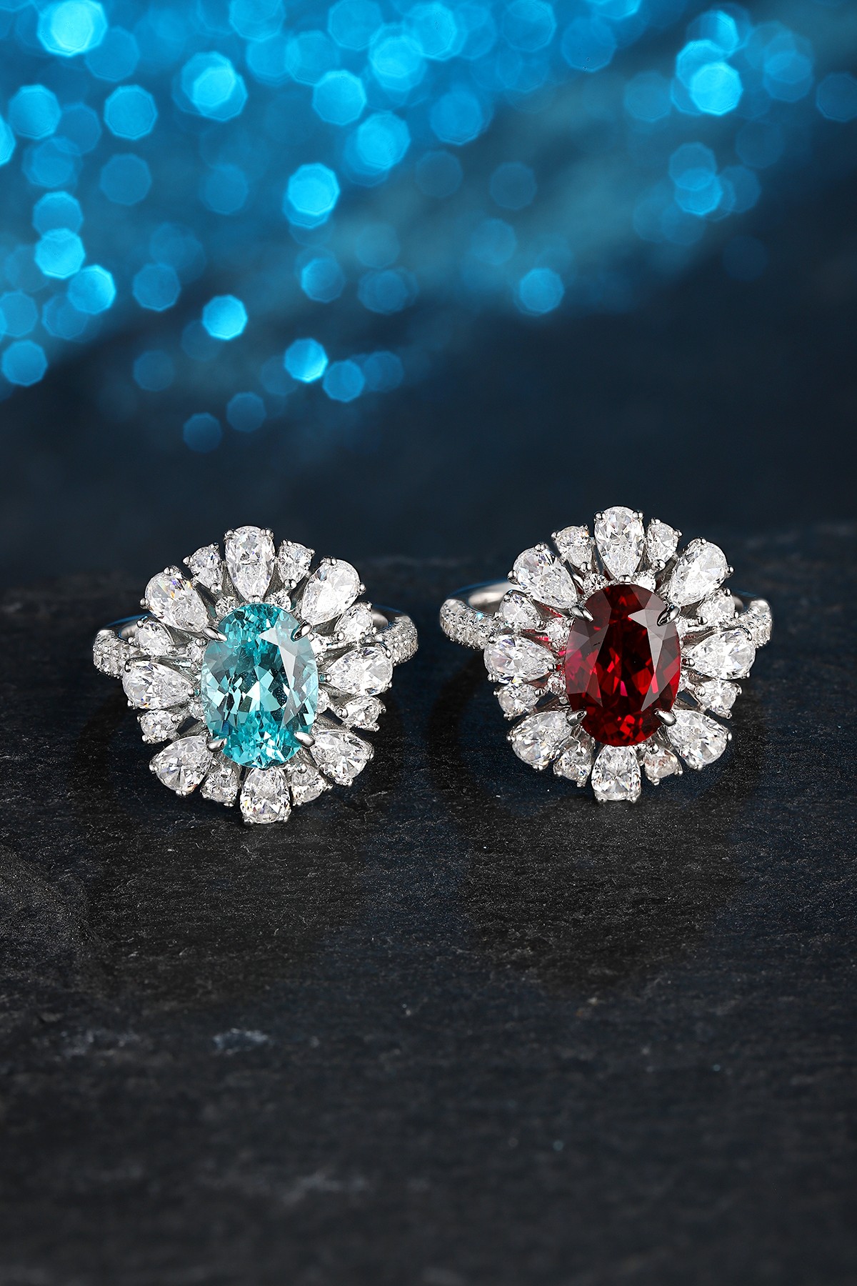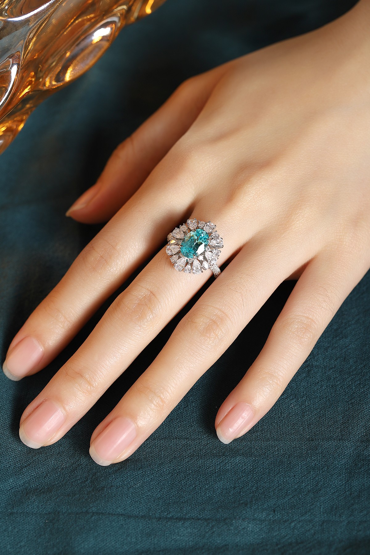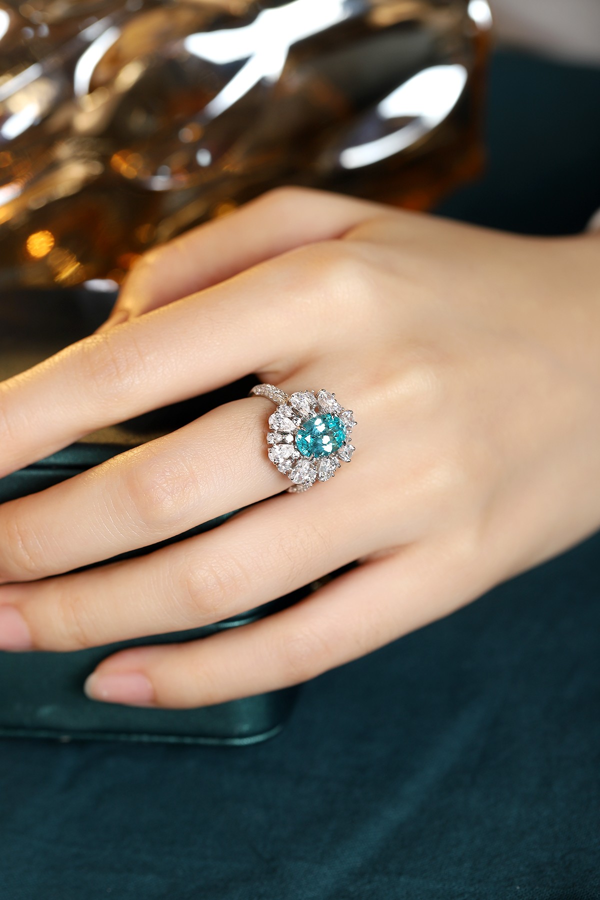 This Lab-Grown Paraiba of Diamond Simulants Gemstone Sterling Silver Ring showcases a vibrant oval-cut centerpiece made from premium quality lab-grown Paraiba, admired for its tropical ocean-blue hue. Surrounding the center gem is a radiant arrangement of high-quality AAAAA cubic zirconia diamond simulants, combining pear and marquise cuts for a fan-like floral motif. The split Sterling Silver band is encrusted with additional stones, adding brilliance from every angle.