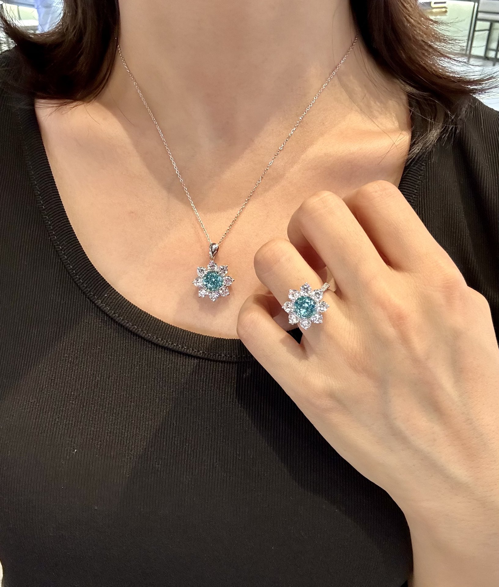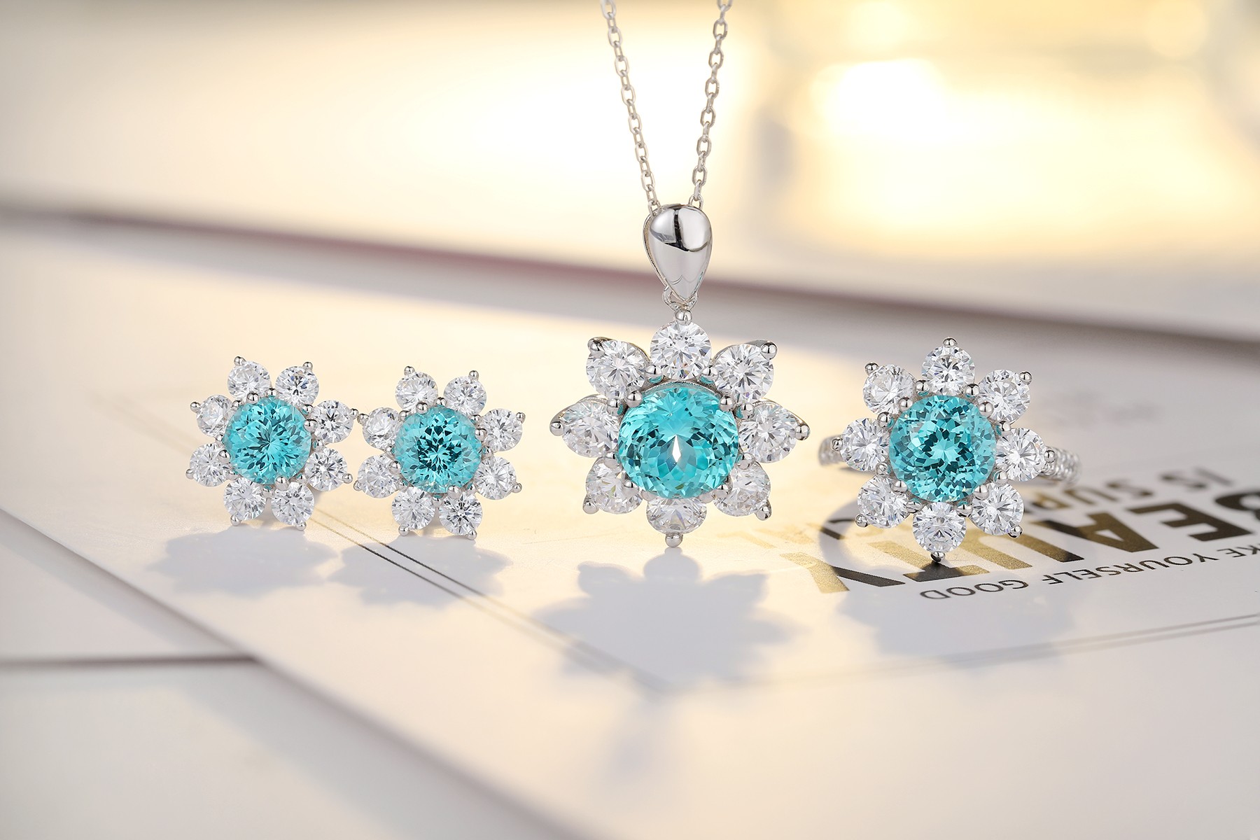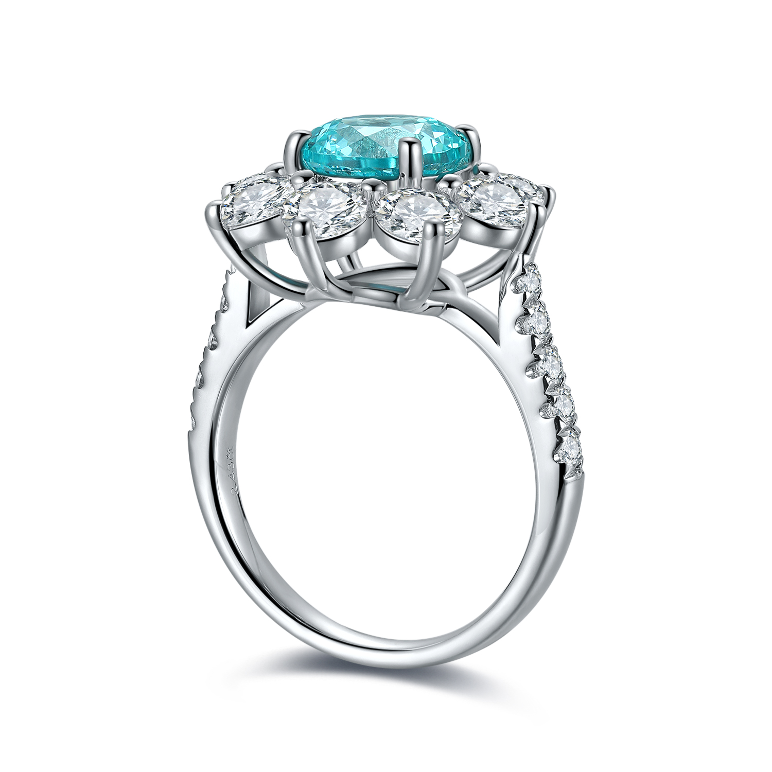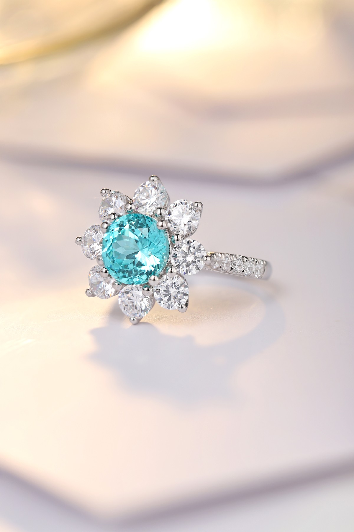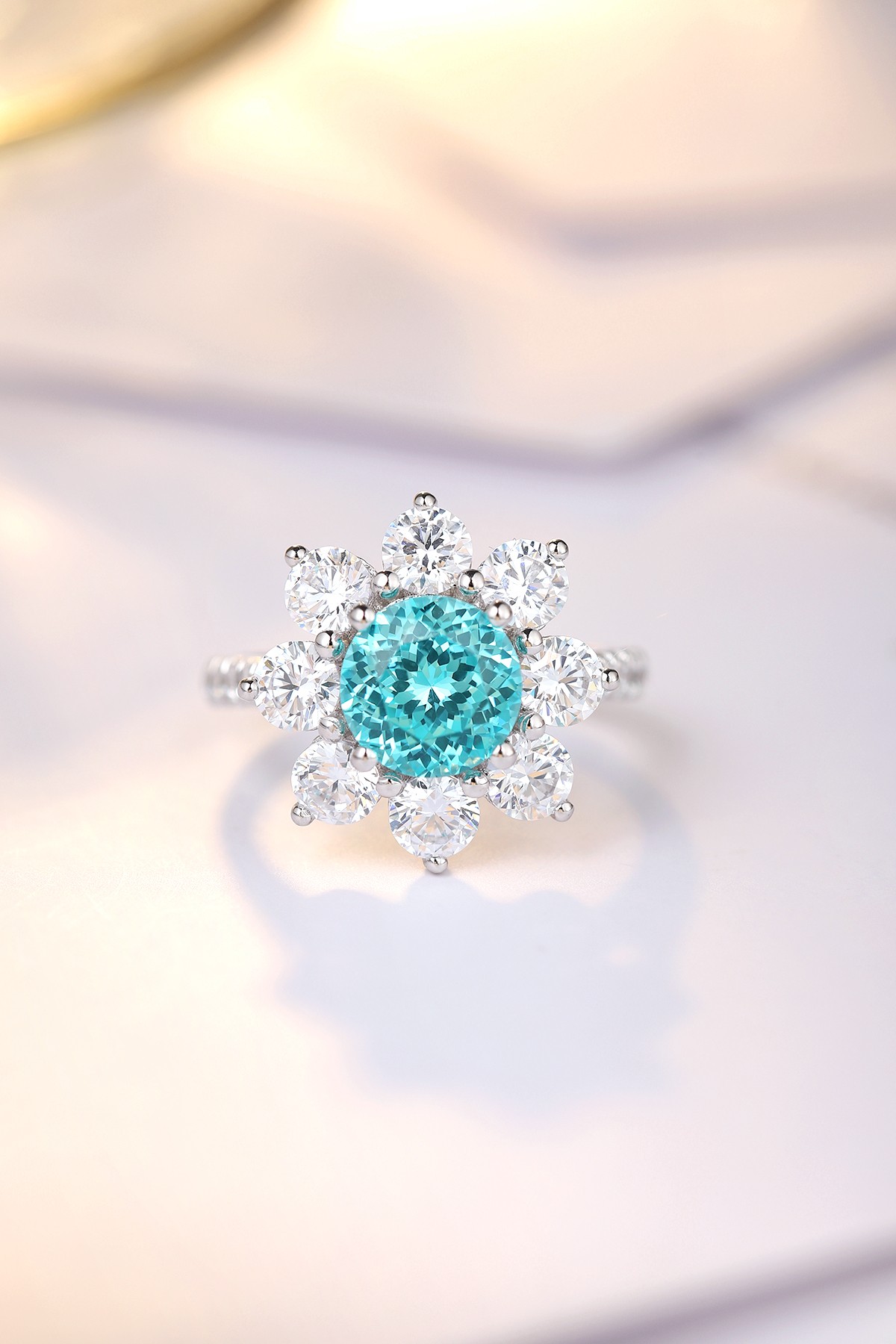 This Lab-Grown Paraiba of Diamond Simulants Gemstone Sterling Silver Ring centers on a luminous round-cut Paraiba gemstone, lab-created to premium standards for outstanding clarity and color. Framed by eight brilliant high-quality AAAAA cubic zirconia diamond simulants, the ring takes on the shape of a blooming flower. The split band, also set with sparkling accents, completes the elegant design in polished Sterling Silver.