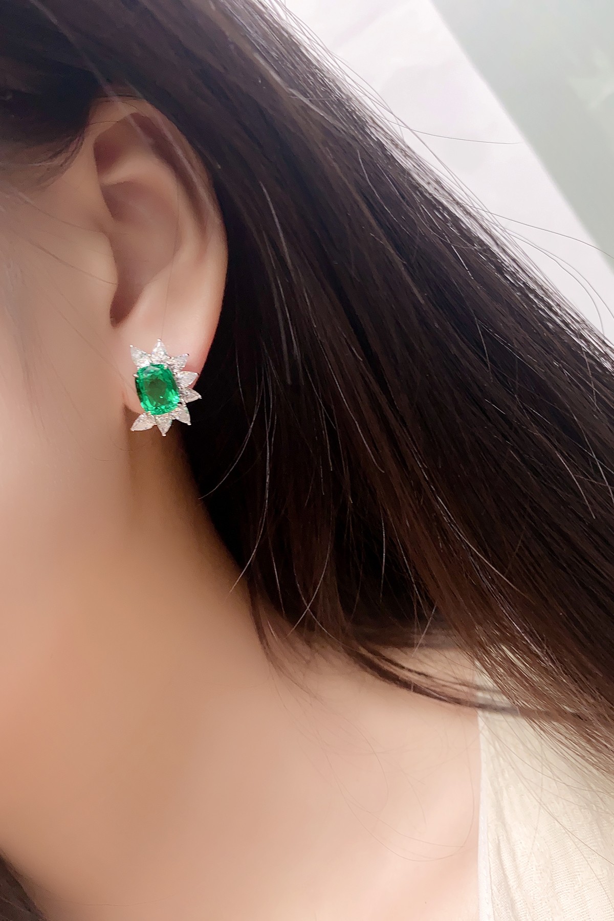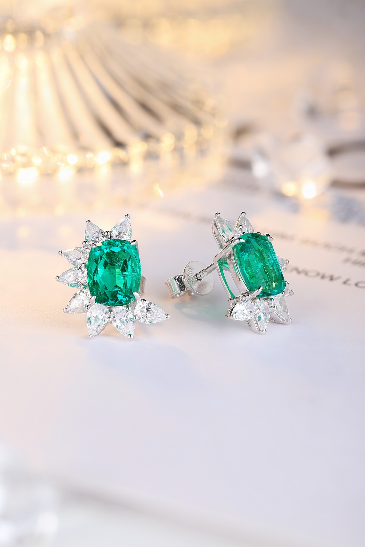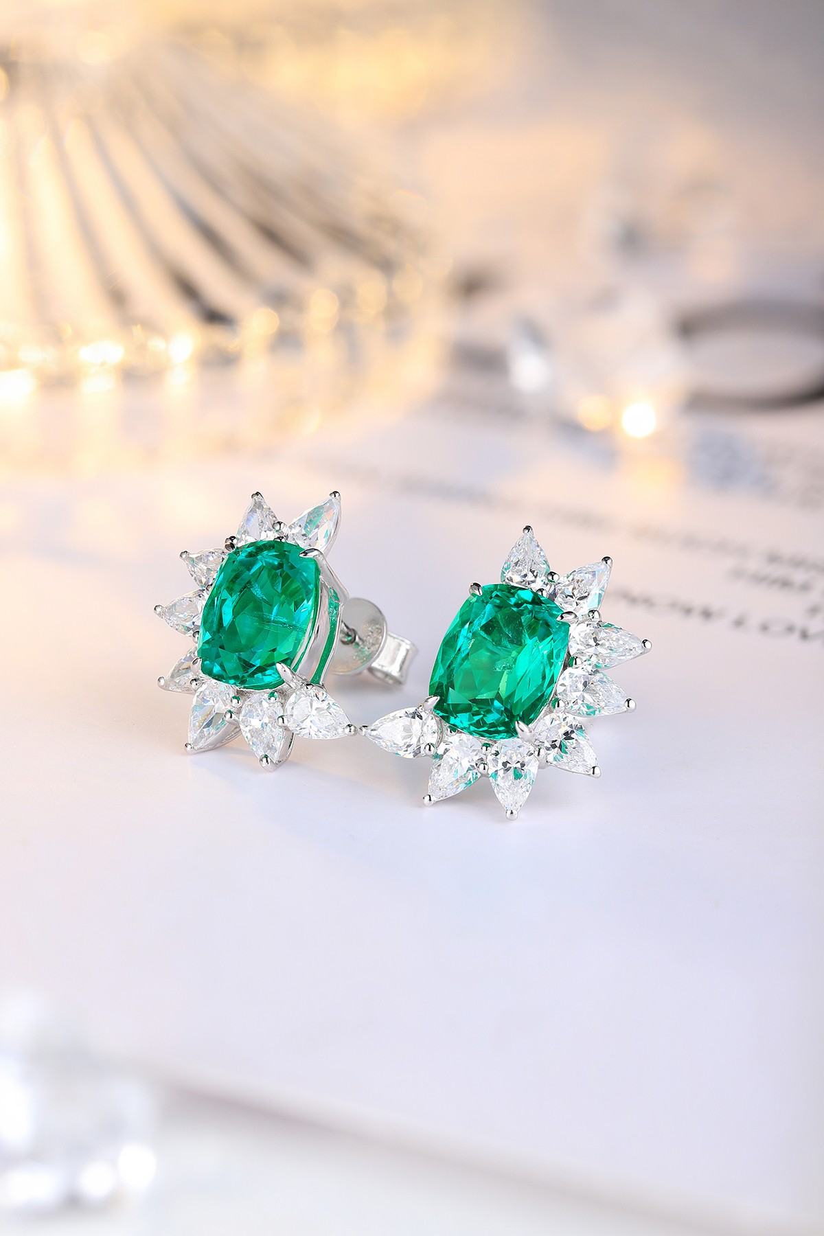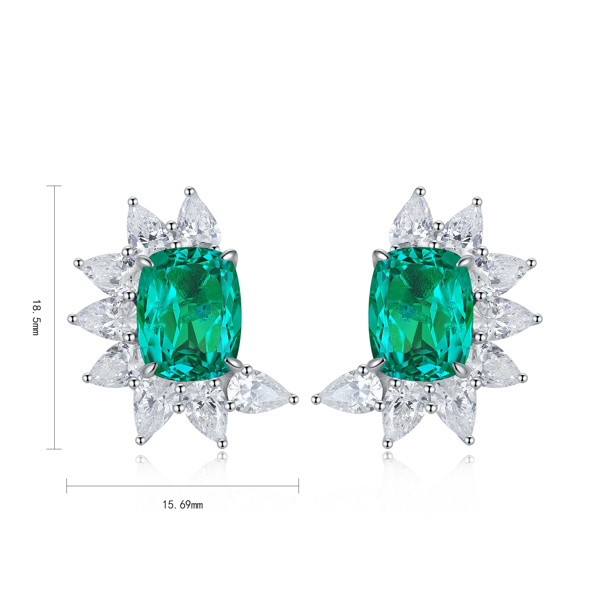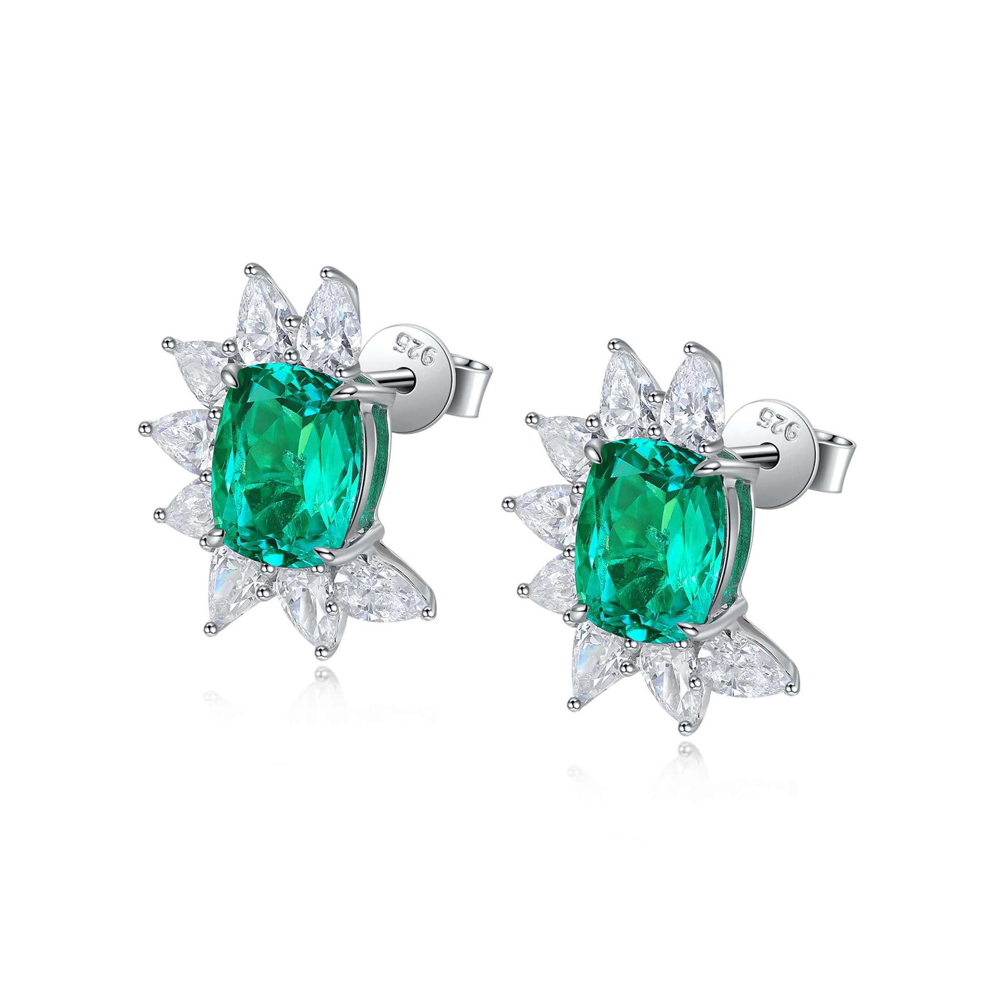 These Lab-Grown Emerald of Diamond Simulants Gemstone Sterling Silver Earrings boast a breathtaking cushion-cut centerpiece in vibrant green, symbolizing renewal and prosperity. Encircling the emeralds are meticulously arranged marquise-cut AAAAA cubic zirconia diamond simulants, forming a radiant starburst pattern that magnifies brilliance and adds dynamic contrast. The polished Sterling Silver setting enhances the interplay of sparkle and color, offering both durability and timeless beauty.