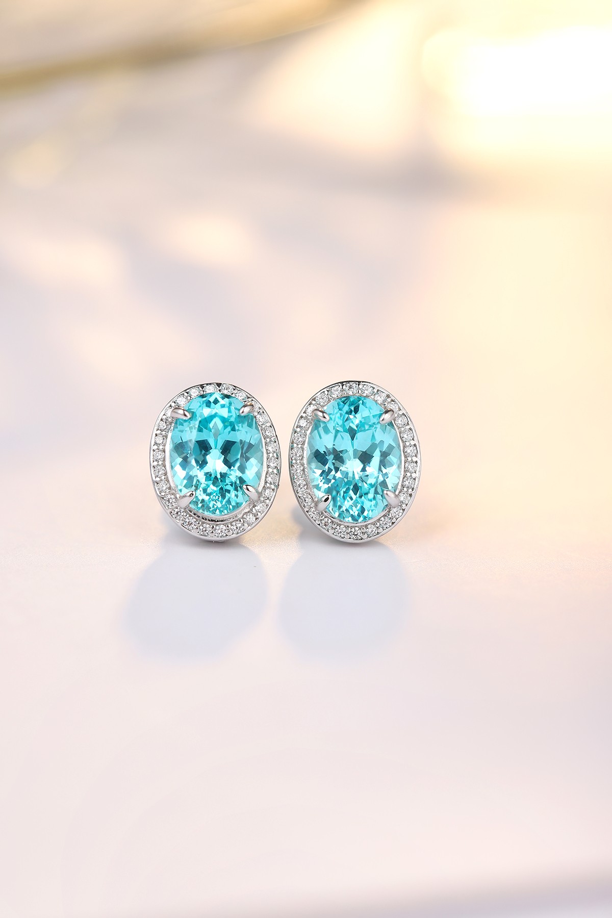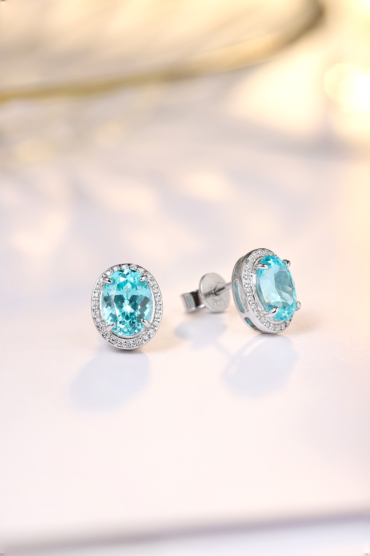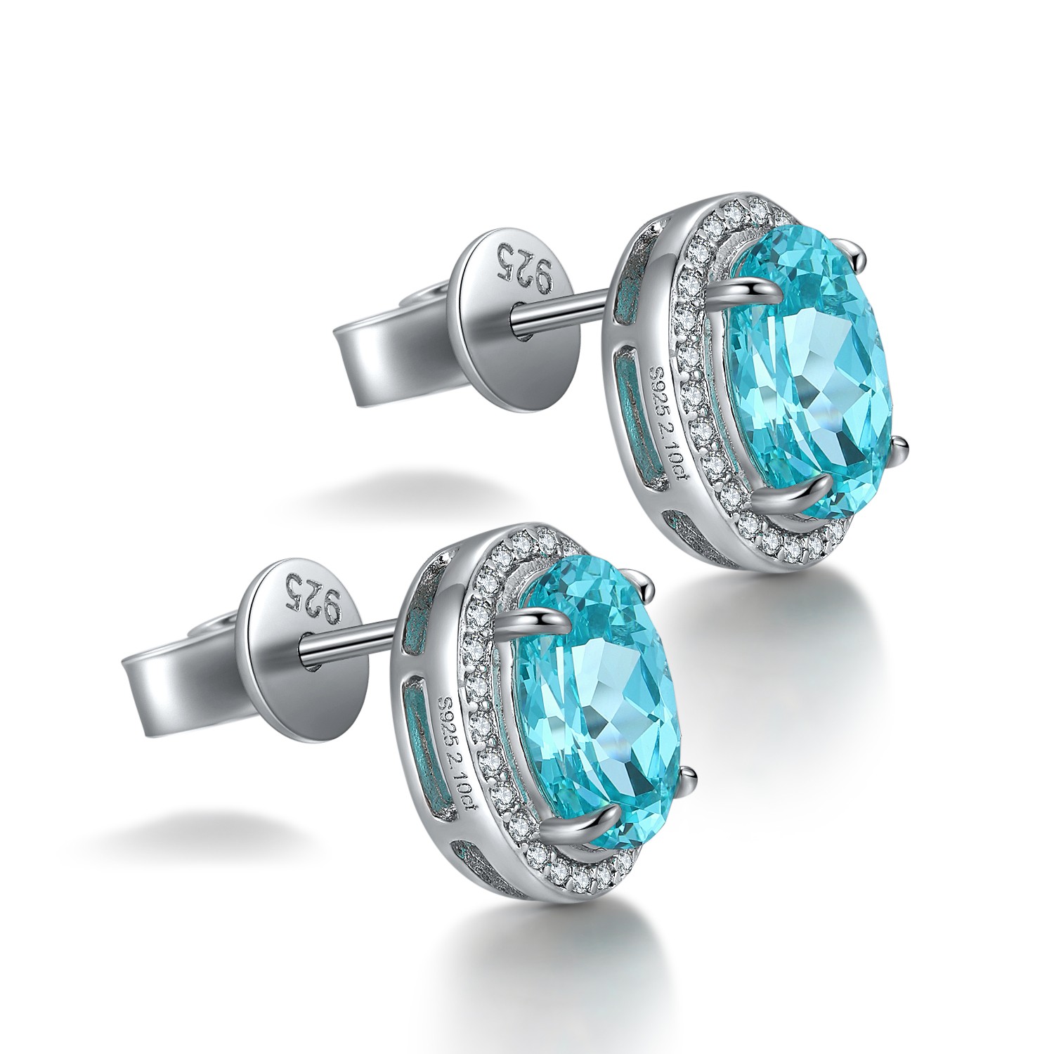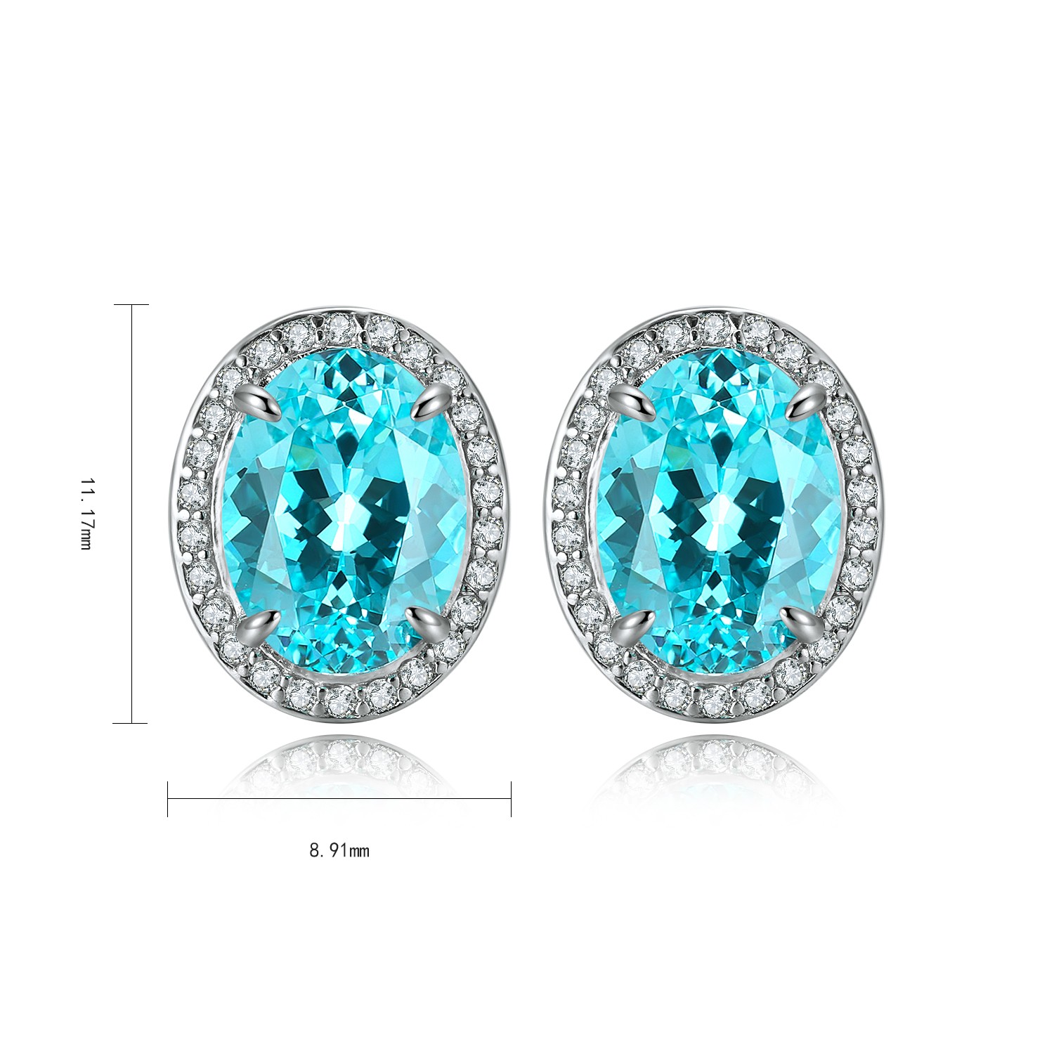 These Lab-Grown Paraiba of Diamond Simulants Gemstone Sterling Silver Earrings embrace understated elegance and contemporary sophistication. The vivid oval-cut Paraiba gemstones, glowing with a striking aqua-blue hue, sit gracefully at the center, expertly framed by a delicate halo of AAAAA cubic zirconia diamond simulants.