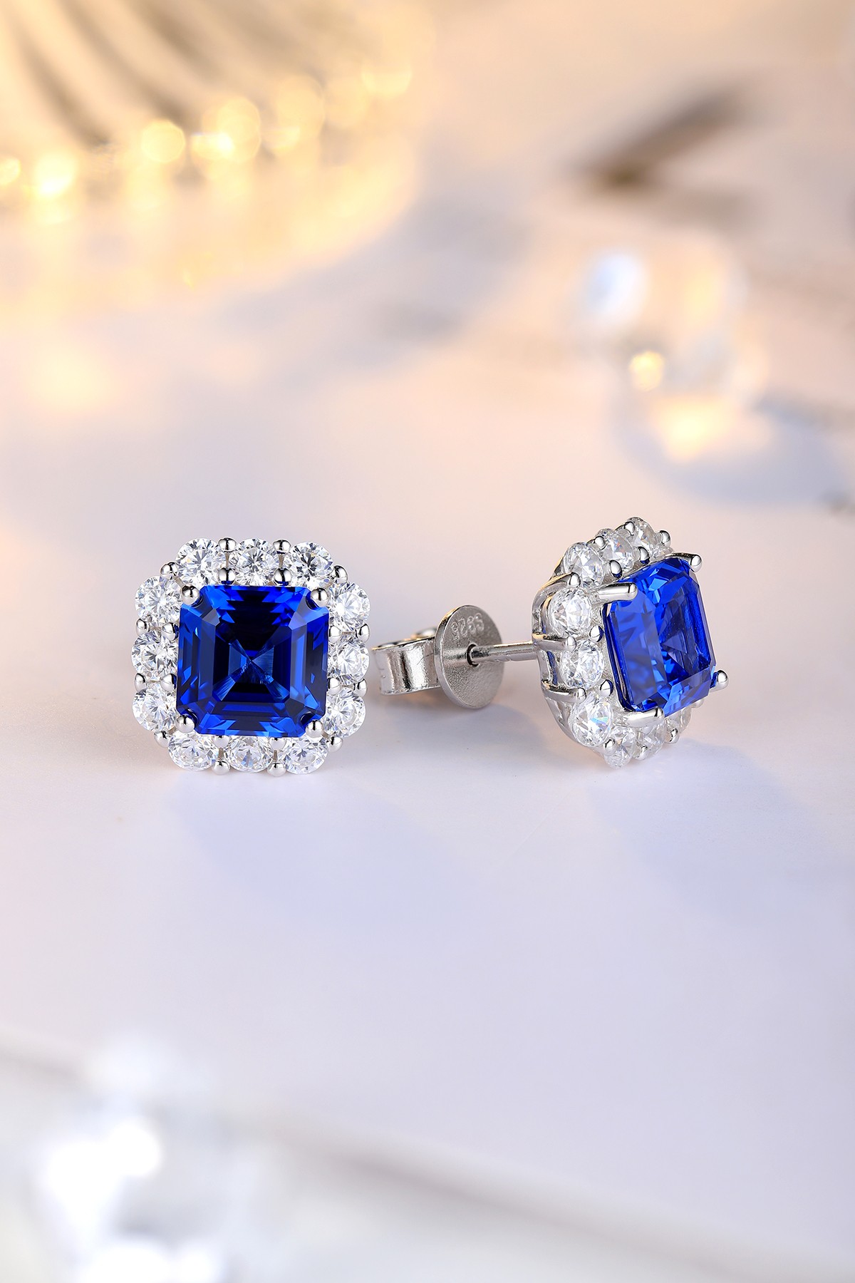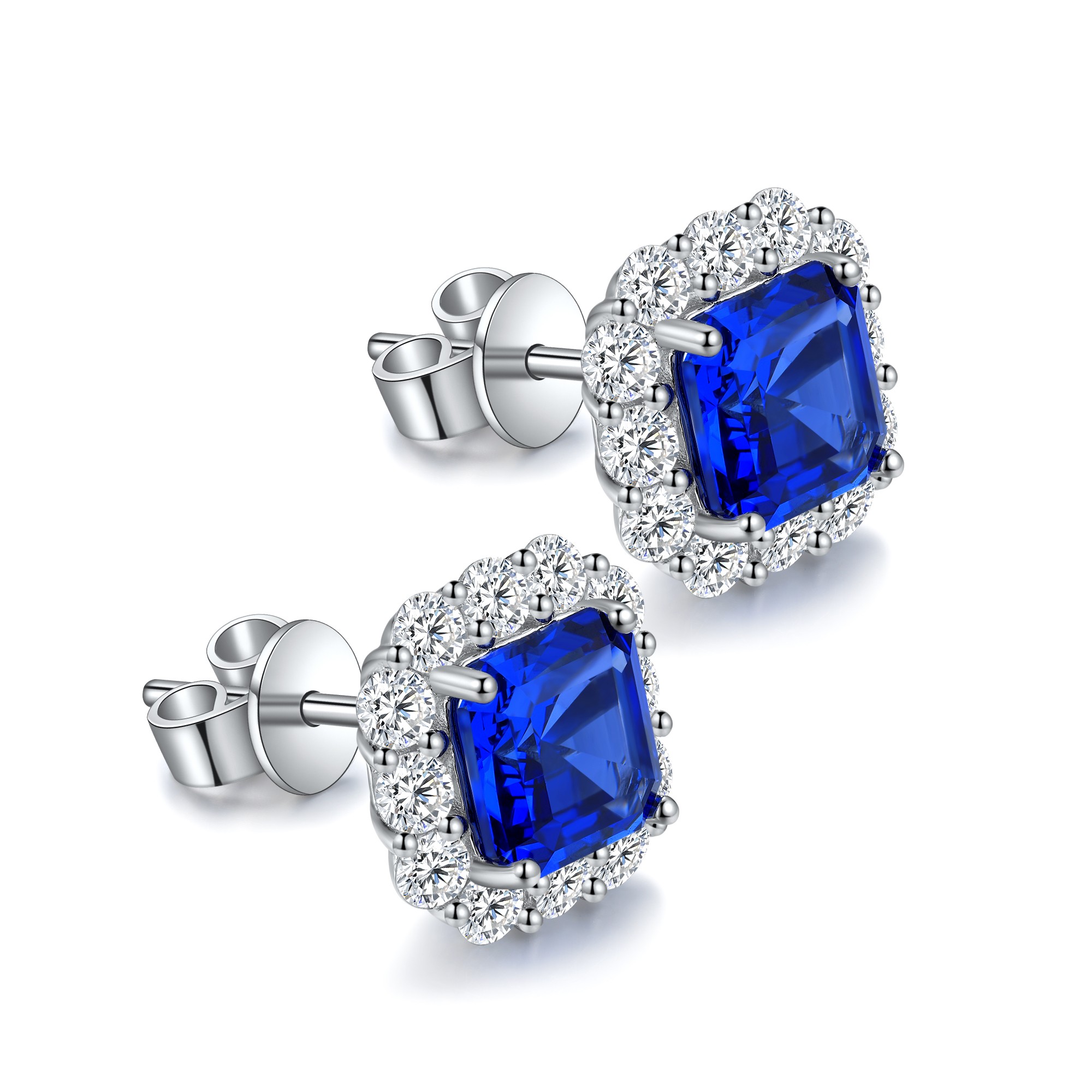 Classic elegance meets modern craftsmanship in these Lab-Grown Blue Sapphire of Diamond Simulants Gemstone Sterling Silver Earrings. The emerald-cut sapphires, known for their sharp lines and luxurious depth of color, anchor the design with sophistication and poise. Surrounding each vibrant sapphire is a radiant halo of AAAAA cubic zirconia diamond simulants, enhancing brilliance and adding irresistible sparkle. Set in polished Sterling Silver, these earrings deliver refined glamour perfect for both special occasions and upscale everyday wear.