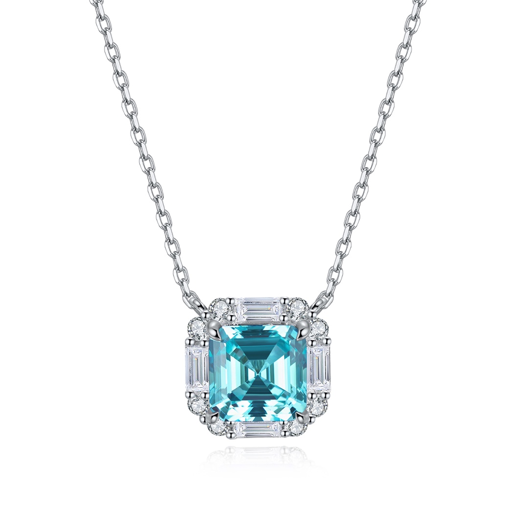 This Lab-Grown Paraiba Gemstone Necklace offers a contemporary twist on classic luxury. The breathtaking emerald-cut Paraiba centerpiece glows with a captivating aqua brilliance, artfully surrounded by a geometric halo of radiant diamond simulants, enhancing the gemstone’s clarity and depth.