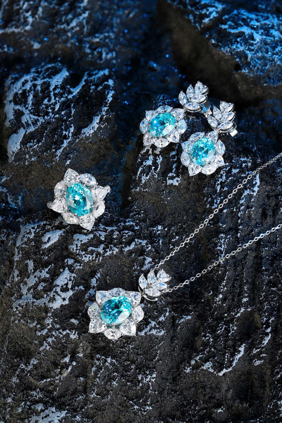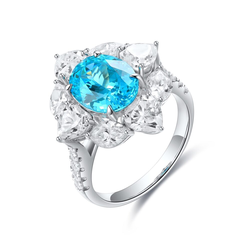 This Lab-Grown Paraiba of Diamond Simulants Gemstone Sterling Silver Ring features a vivid round-cut center stone, radiating the iconic tropical blue of premium lab-grown Paraiba. Surrounding it is a delicate floral arrangement of high-quality AAAAA cubic zirconia diamond simulants, offering brilliant sparkle and dimension. Additional pavé stones along the Sterling Silver band add extra shine without overwhelming the design.