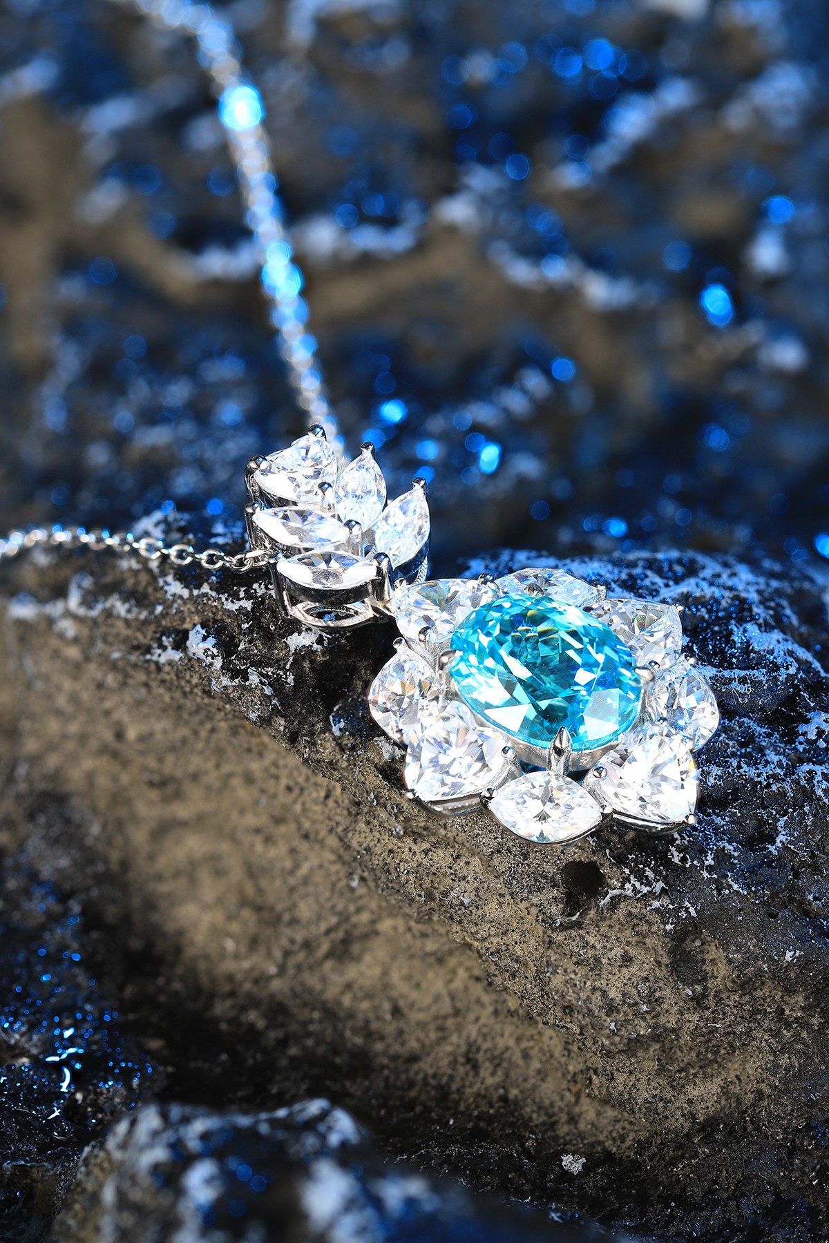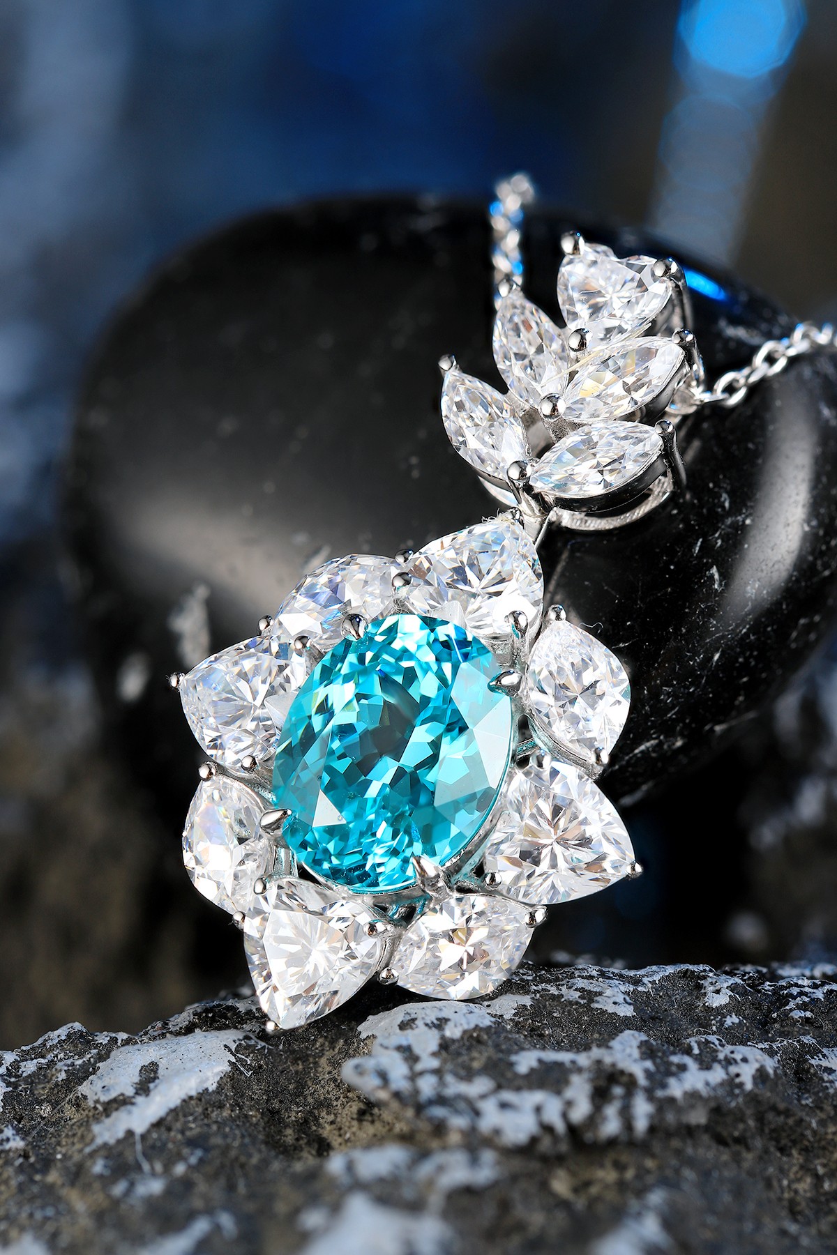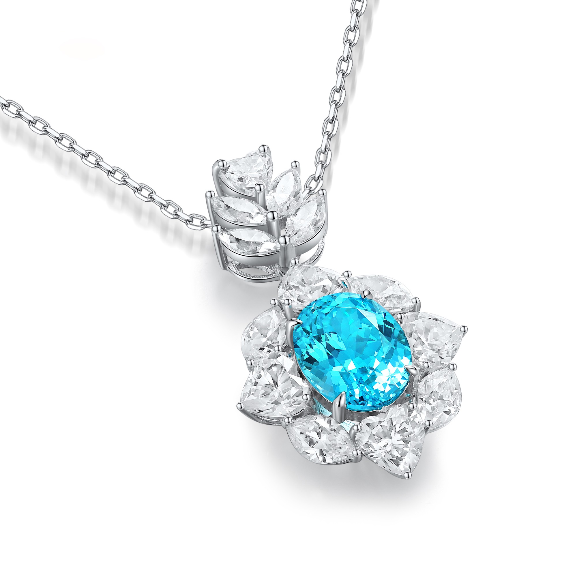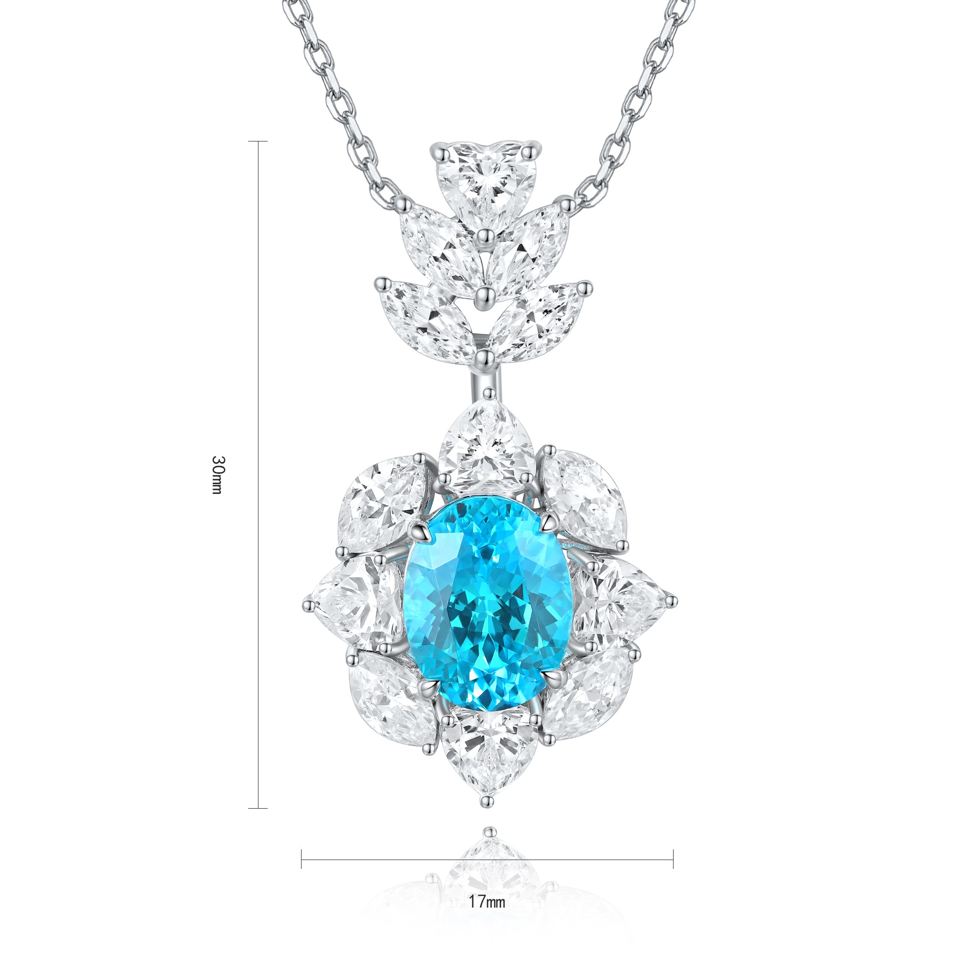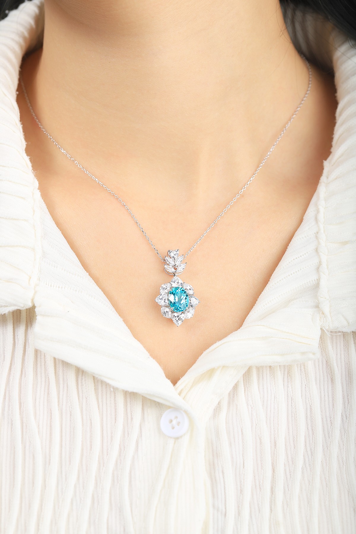 This luxurious Paraiba Lab-Grown Gemstone Sterling Silver Necklace is a celebration of brilliance and refined artistry. The vivid oval-shaped Paraiba gemstone takes center stage with its mesmerizing aqua hue and impeccable clarity.