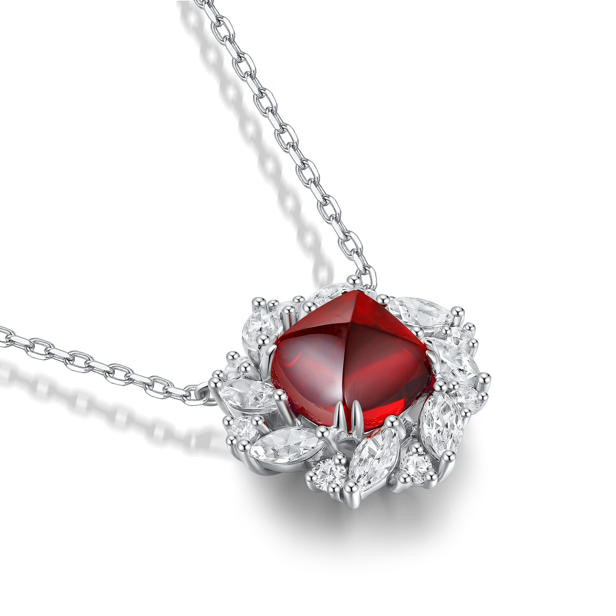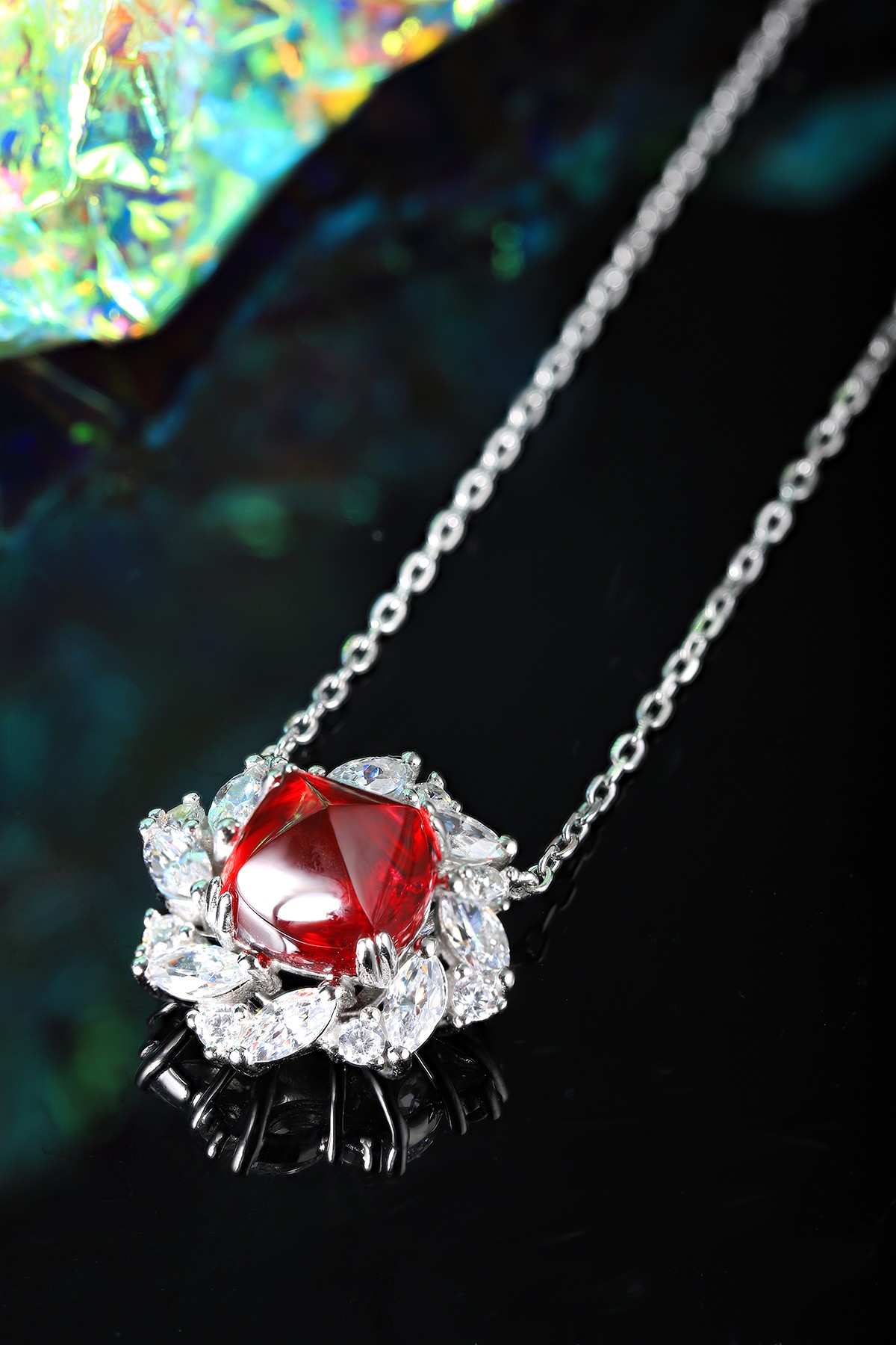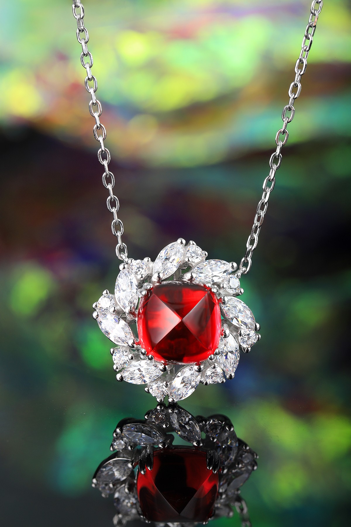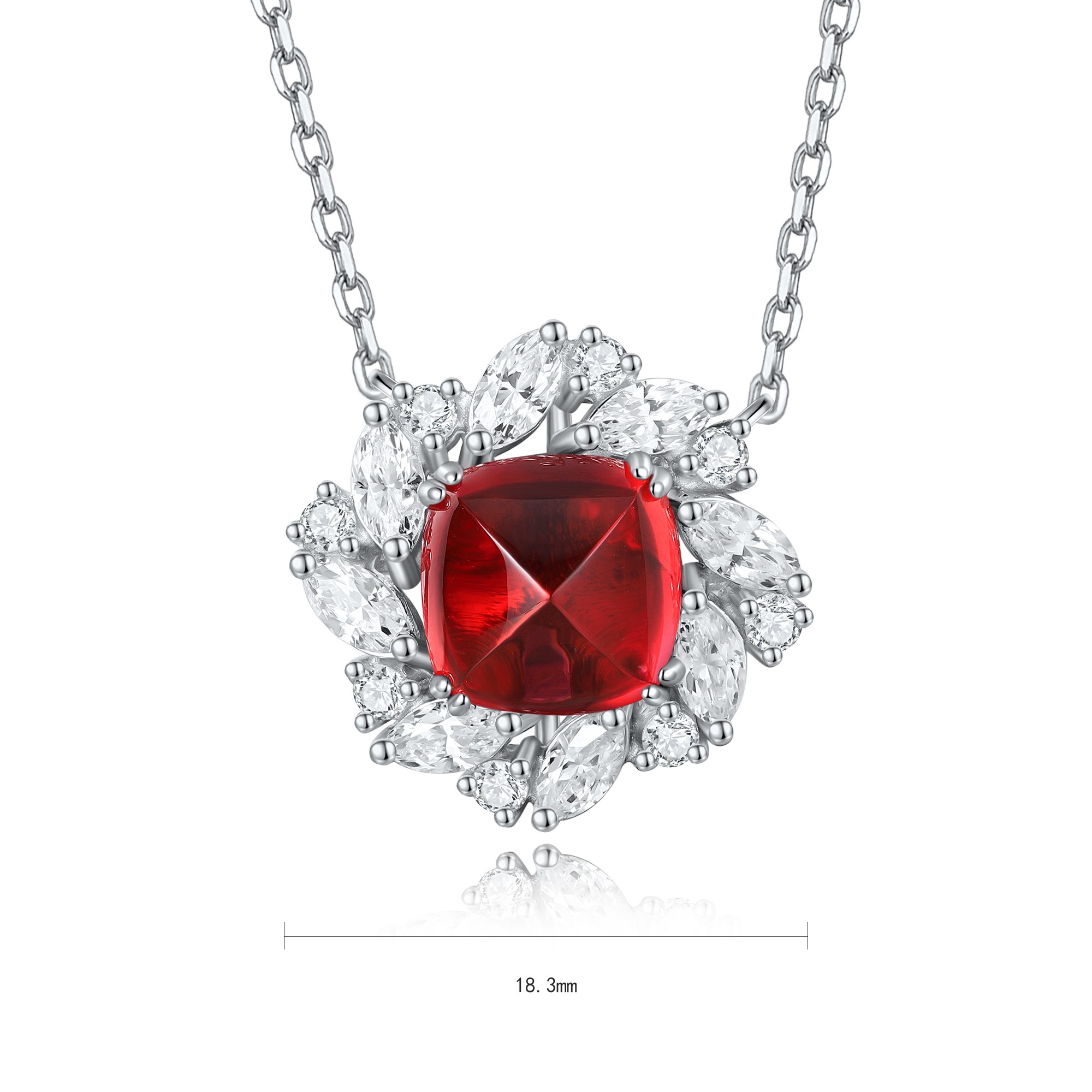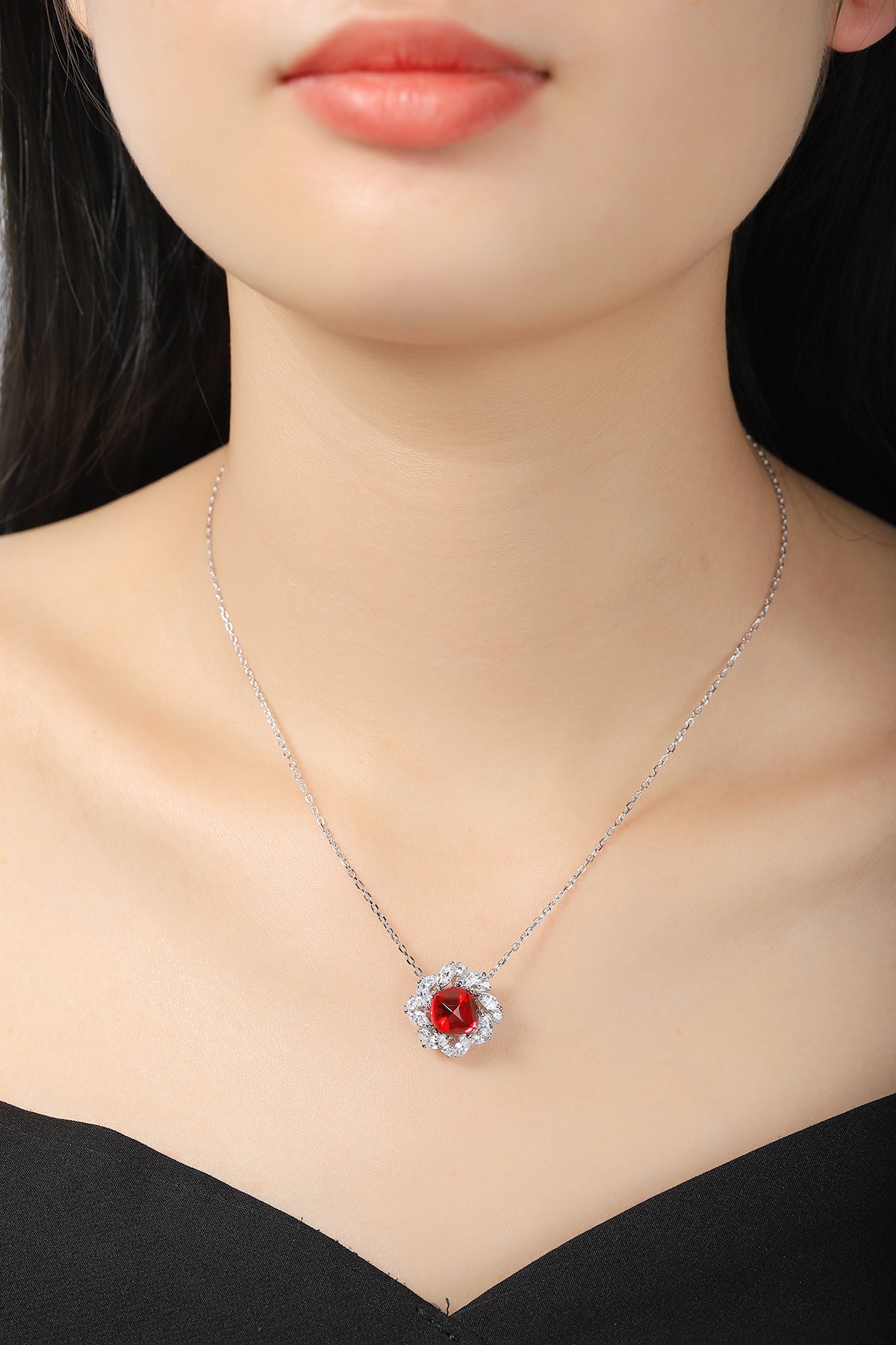 This Lab-Grown Ruby of Diamond Simulants Gemstone Sterling Silver Necklace is a harmonious blend of vibrant color and refined craftsmanship. The bold, cushion-cut ruby radiates a deep crimson brilliance, thoughtfully encircled by marquise-cut diamond simulants that mimic the delicate beauty of petals in full bloom.