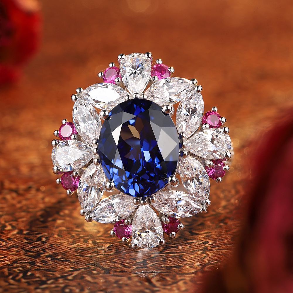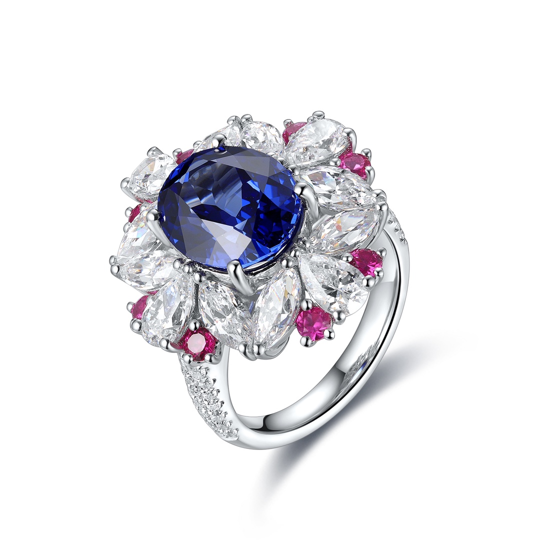 This Lab-Grown Sapphire of Diamond Simulants Gemstone Sterling Silver Ring centers on a magnificent oval-cut sapphire, lab-created to premium standards for its rich royal-blue hue and refined clarity. The gemstone is framed with high-quality AAAAA cubic zirconia diamond simulants in marquise and round cuts, accented by pops of vivid pink cubic zirconia for a regal yet playful effect. All set in polished Sterling Silver, this ring is a true showstopper.