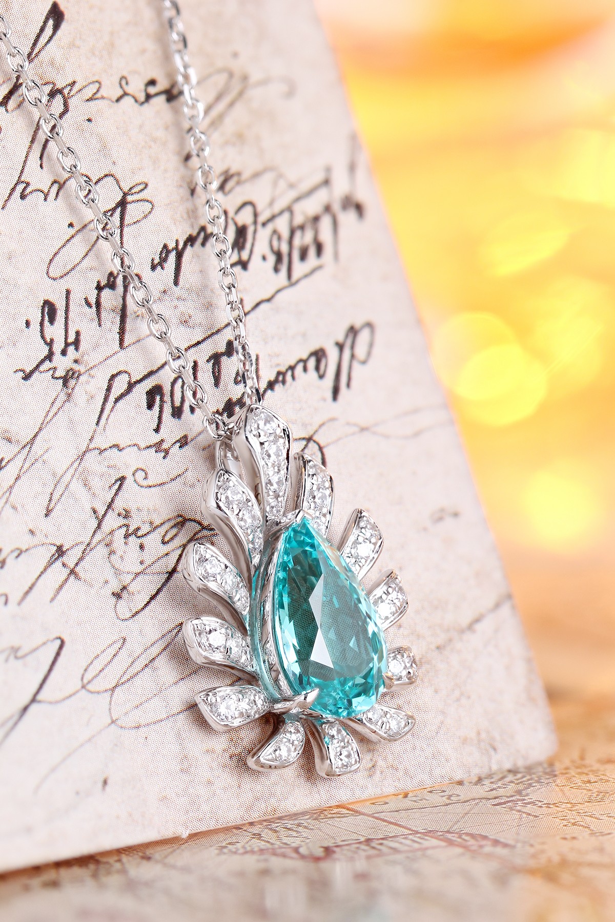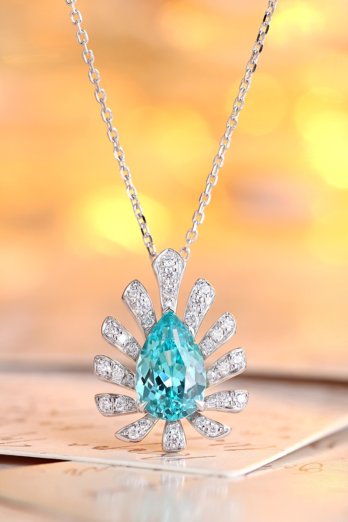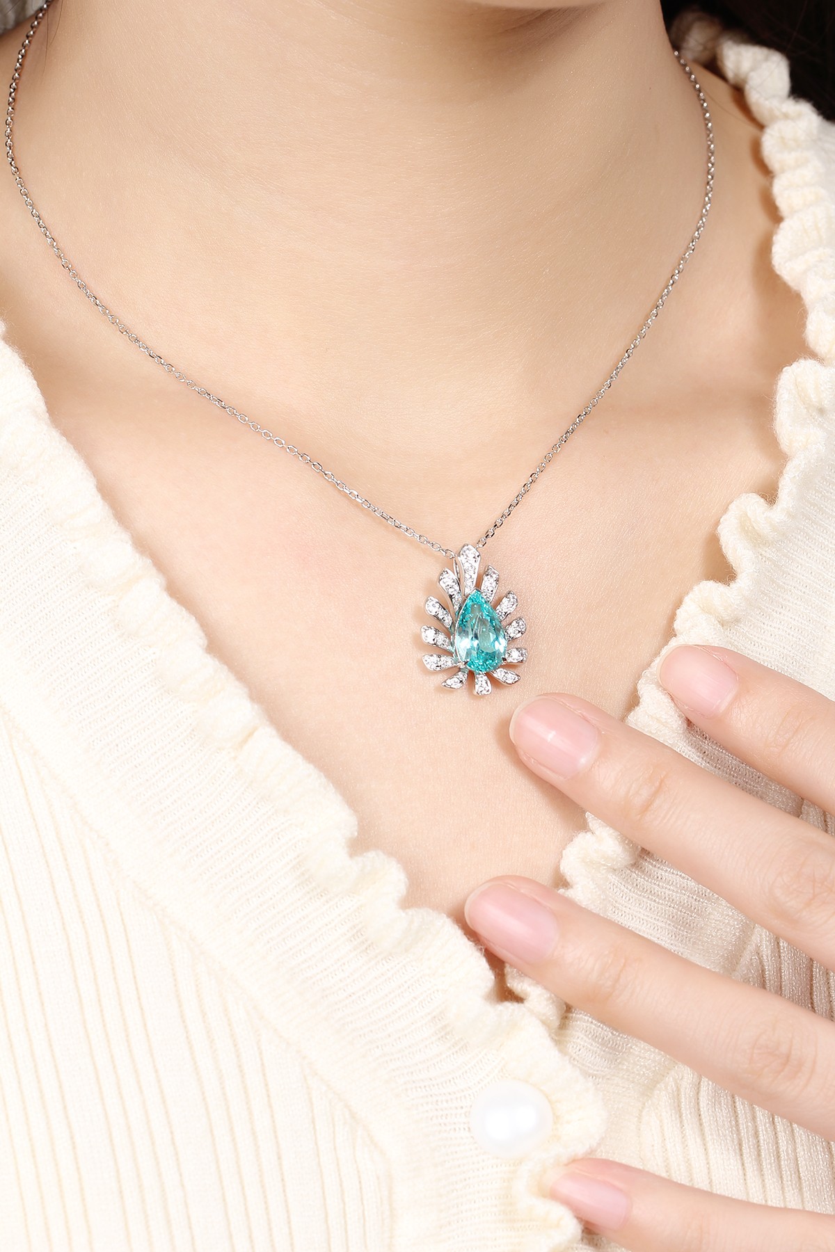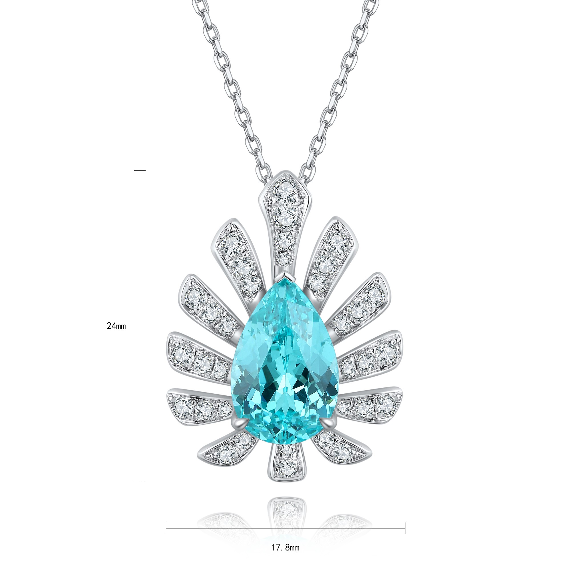 Inspired by the radiant energy of the sun, this stunning Paraiba Lab-Grown Gemstone Sterling Silver Necklace combines natural beauty with contemporary elegance. The luminous pear-shaped Paraiba gemstone is the centerpiece, capturing light with its captivating aqua hue and flawless cut.