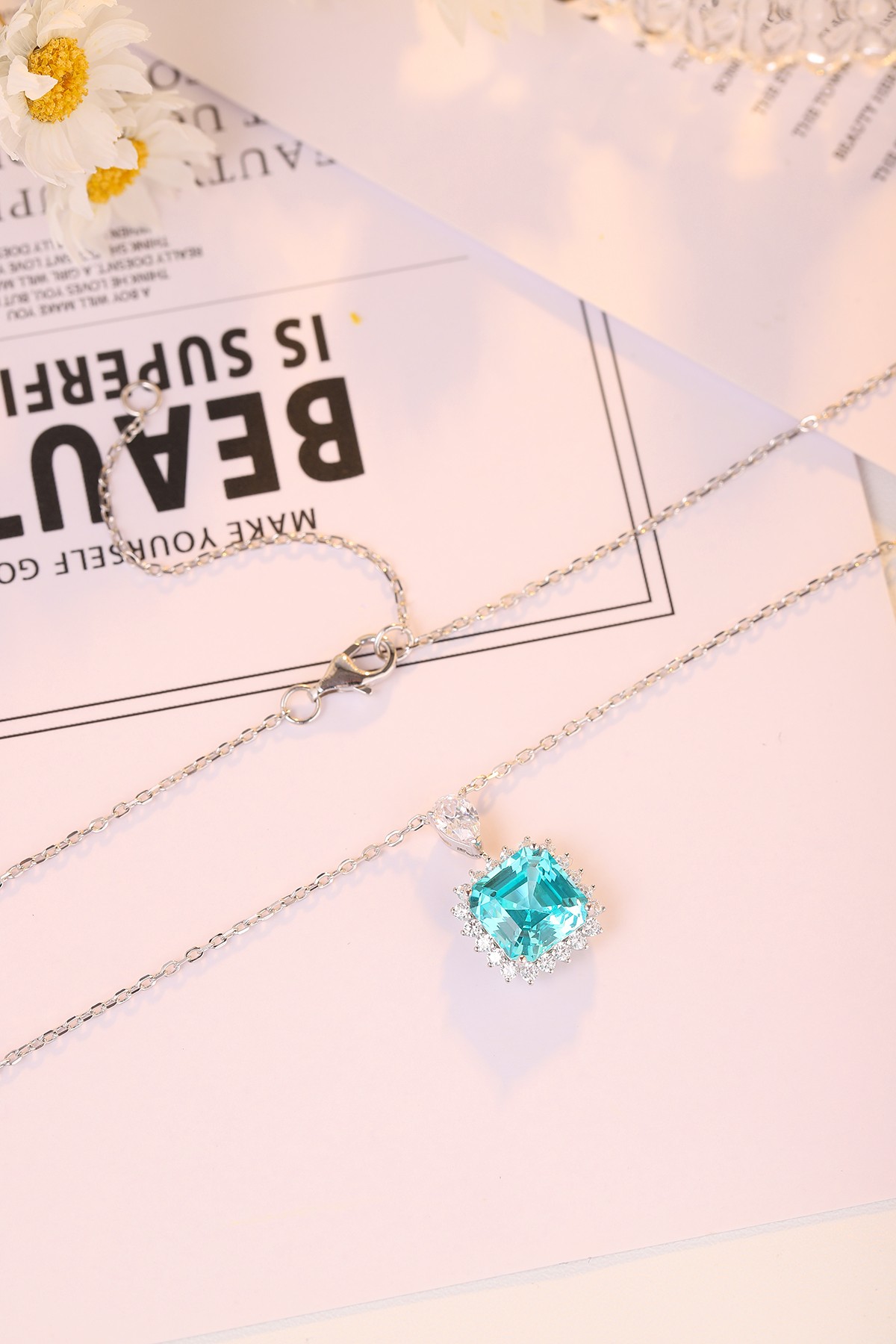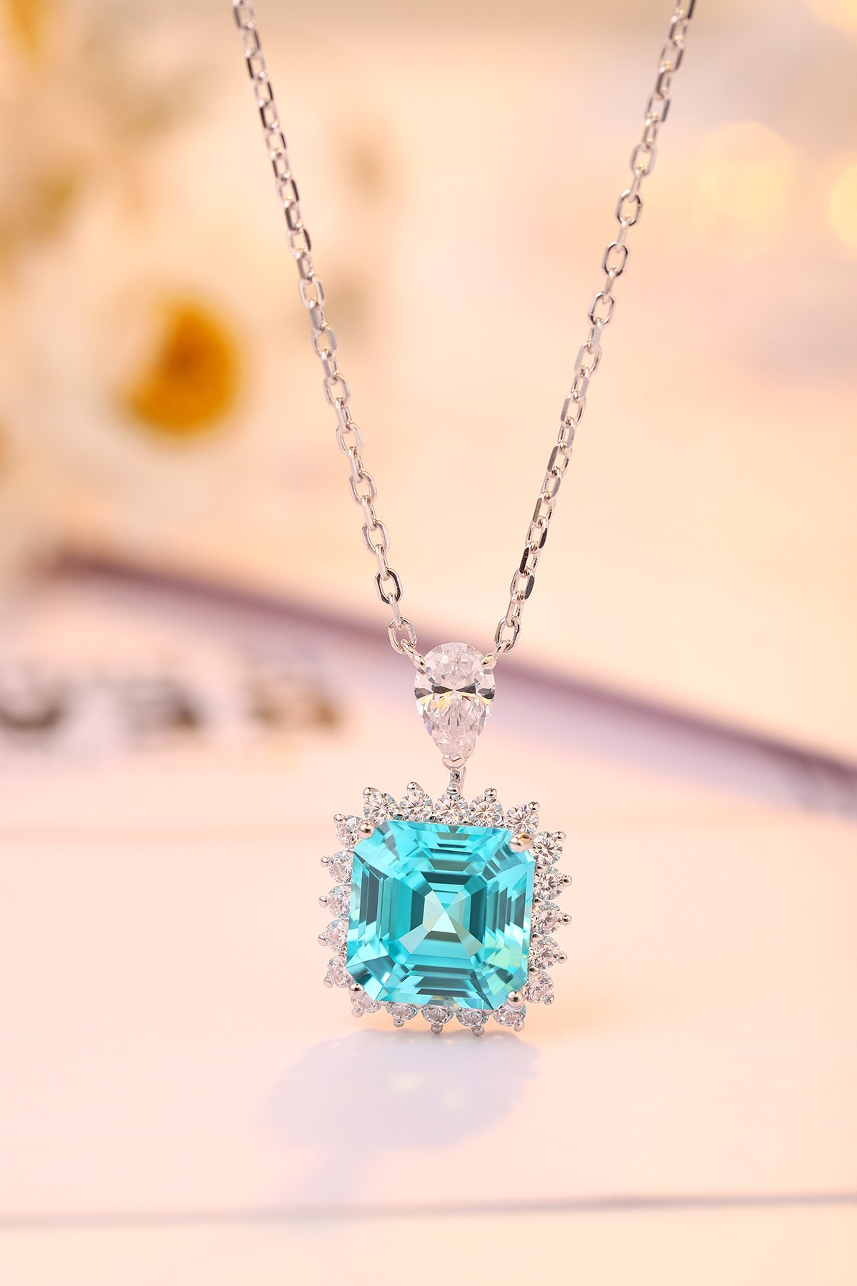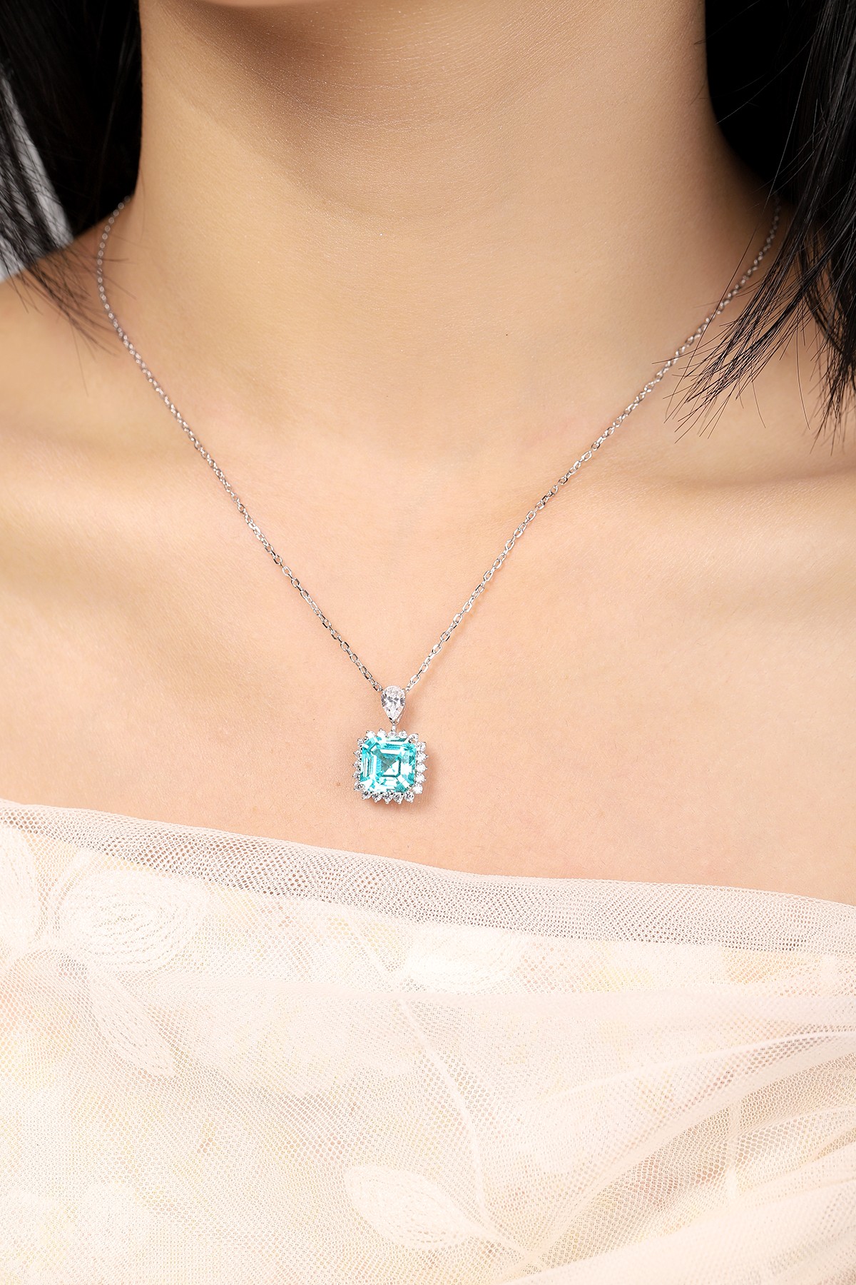 This elegant Asscher-Cut Lab-Grown Paraiba Gemstone Necklace showcases clean lines and timeless geometry, perfectly capturing contemporary luxury. The breathtaking aqua-blue gemstone radiates brilliance, beautifully encircled by a shimmering halo of premium diamond simulants, crafted to enhance every angle with stunning light play.
