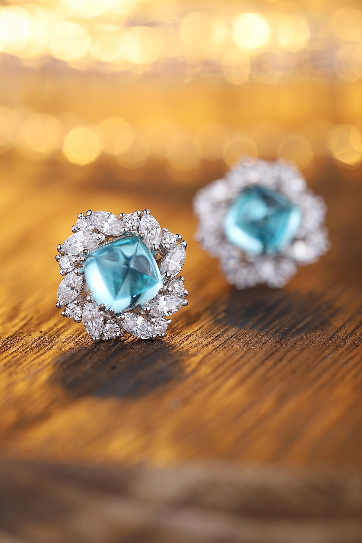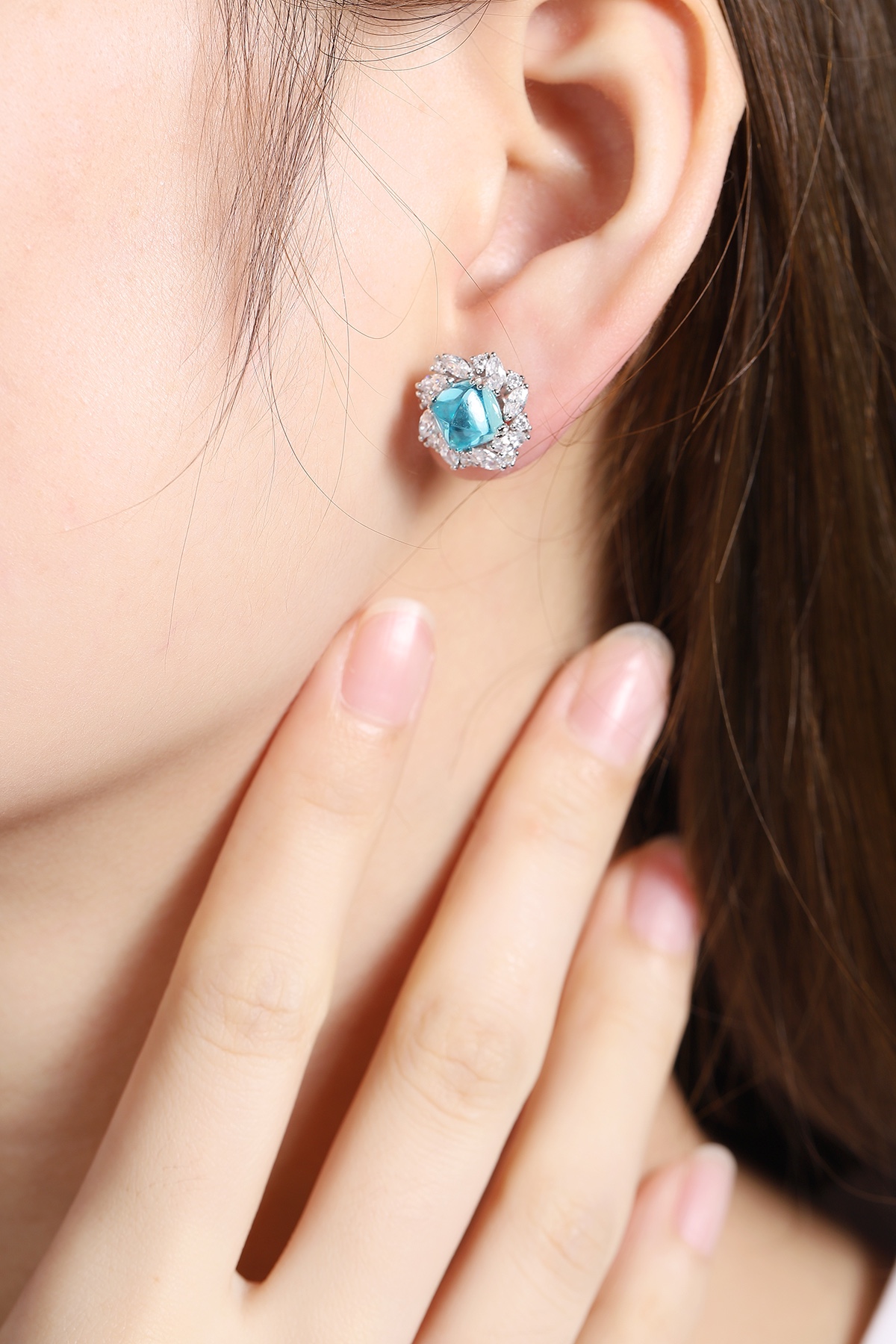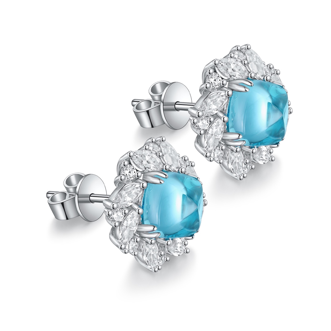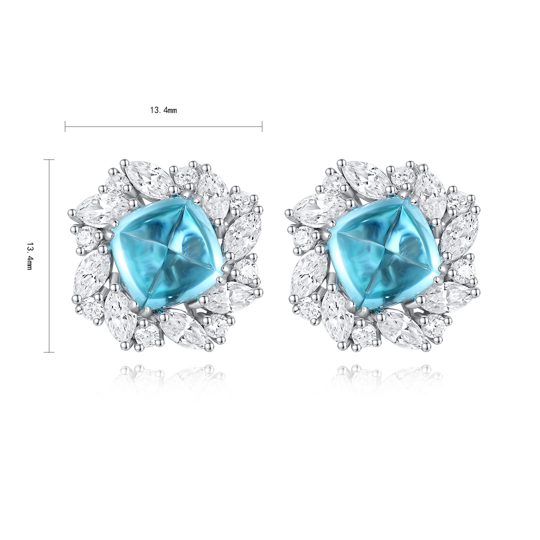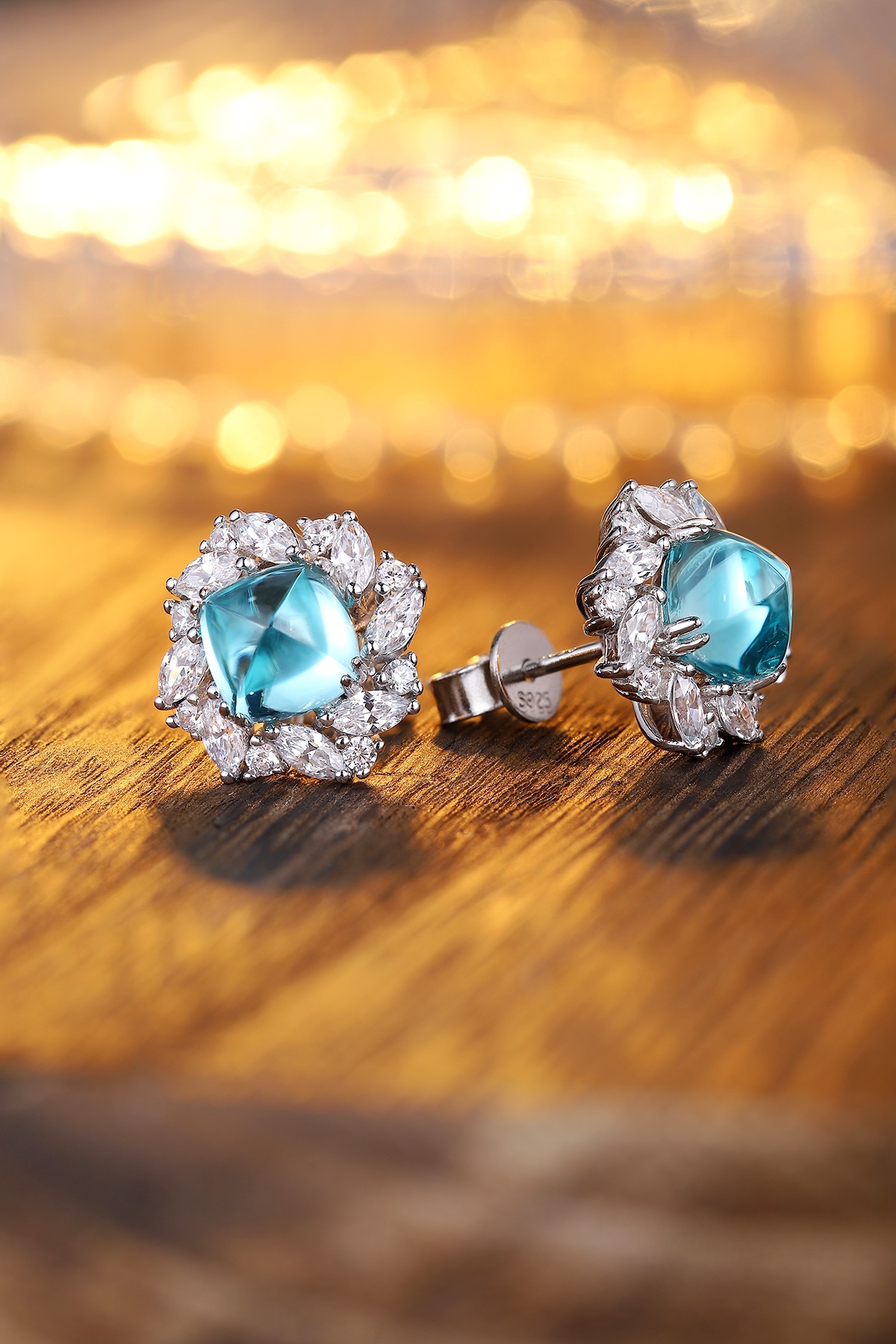 These Lab-Grown Paraiba of Diamond Simulants Gemstone Sterling Silver Earrings radiate elegance with a captivating blend of modern artistry and timeless charm. At the heart of each piece lies a luminous Sugarloaf-cut Paraiba gemstone, prized for its vivid aqua-blue tone and silky, domed surface that gently reflects light from every angle.