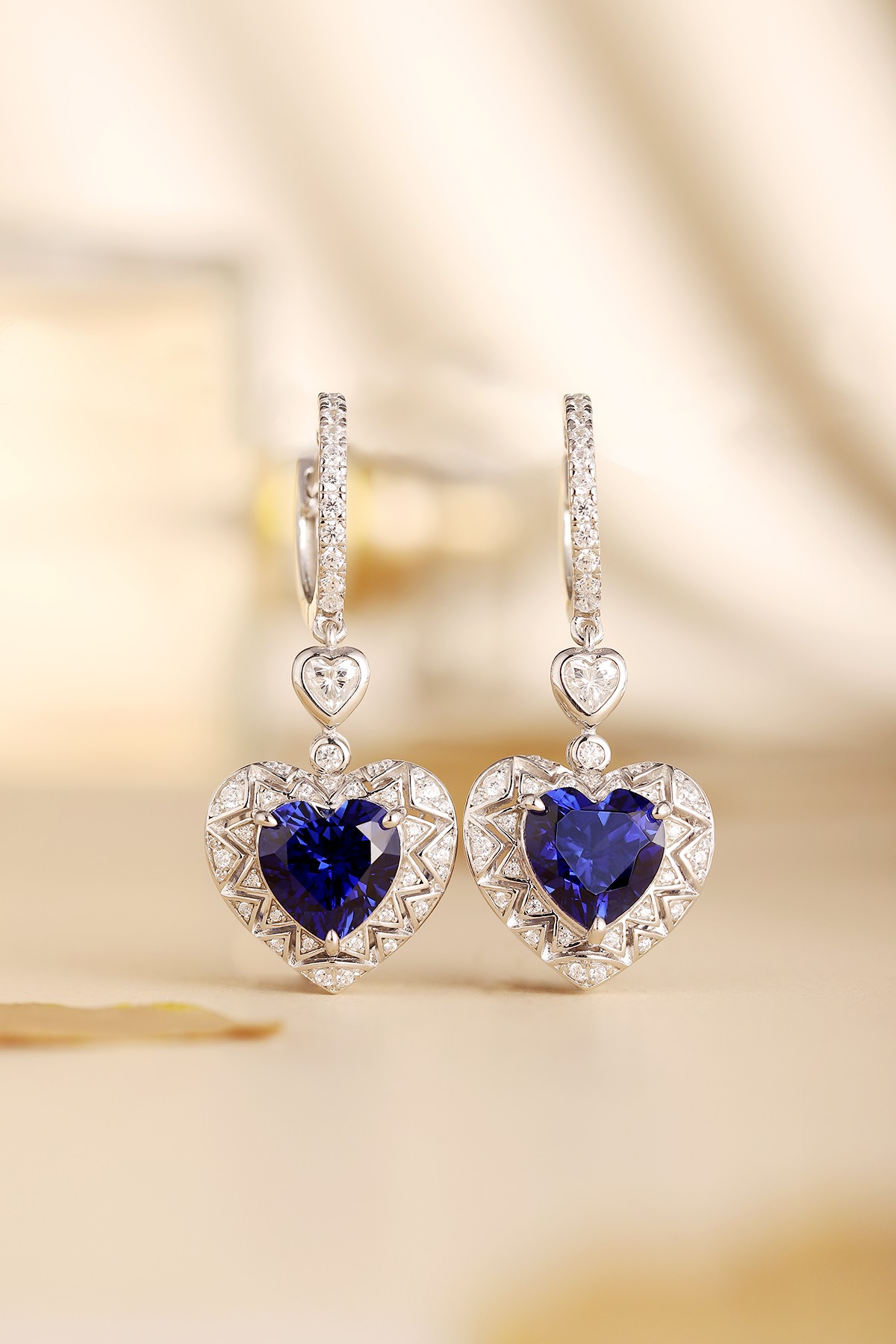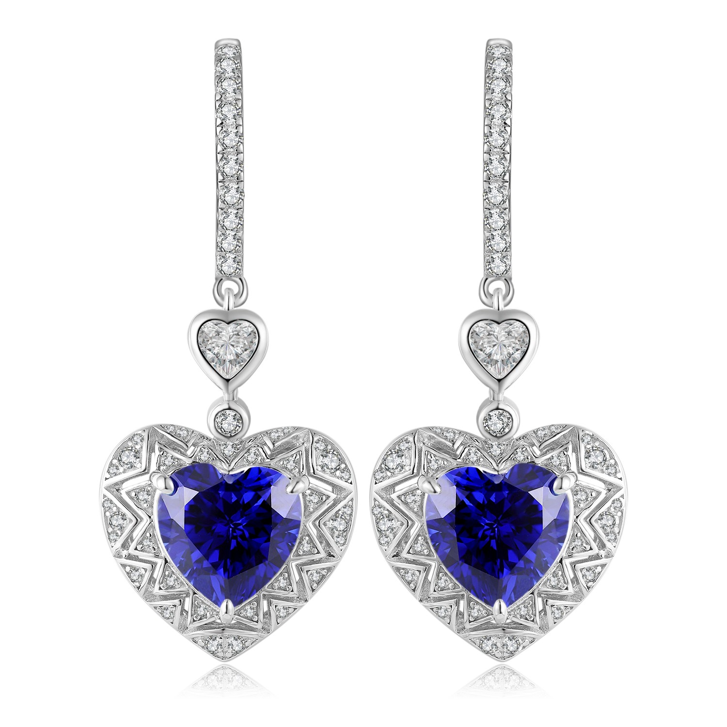 These Lab-Grown Blue Sapphire of Diamond Simulants Gemstone Sterling Silver Earrings are a celebration of love and sophistication. Designed with radiant heart-cut sapphires in a vivid royal blue, each gemstone is encircled by ornate silver heart frames with delicate patterns that enhance their brilliance. Sparkling AAAAA cubic zirconia diamond simulants are gracefully placed along the ear hooks and in the connecting mini-heart, offering extra shine with every movement. Set in polished Sterling Silver, the drop design brings graceful sway and charm, perfect for adding a touch of elegance to any special occasion.