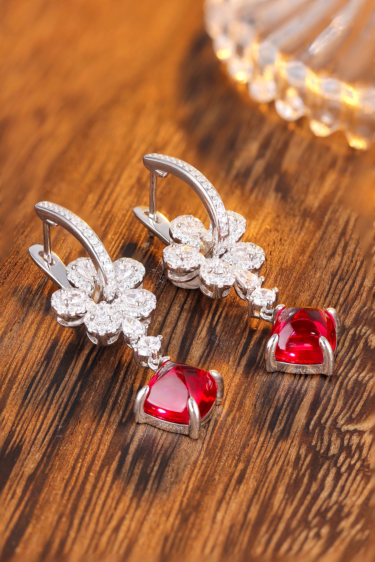 Above the ruby centerpiece, high-quality AAAAA cubic zirconia diamond simulants form delicate floral patterns and connections that enhance the earrings’ graceful silhouette and add layers of sparkle. These diamond simulants are precisely cut and polished to replicate the brilliance and fire of real diamonds.
