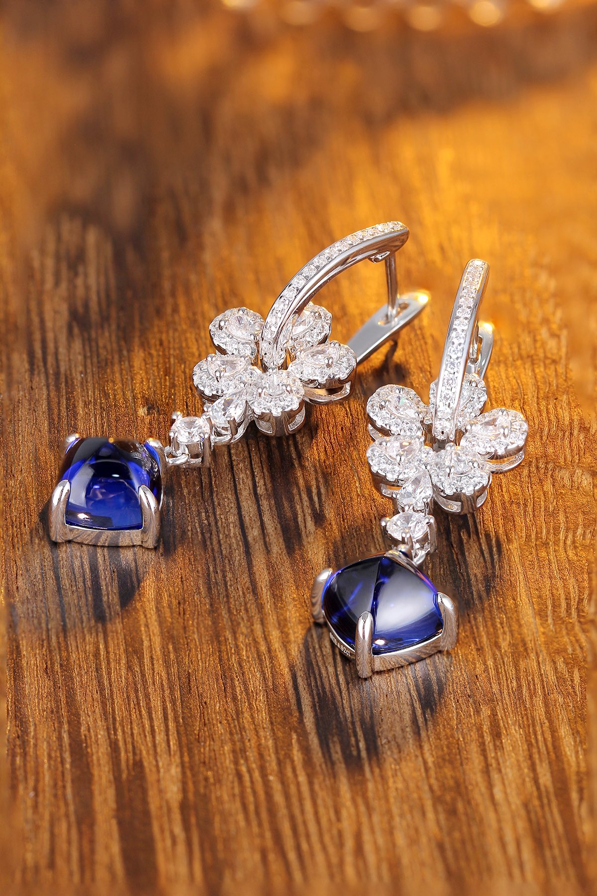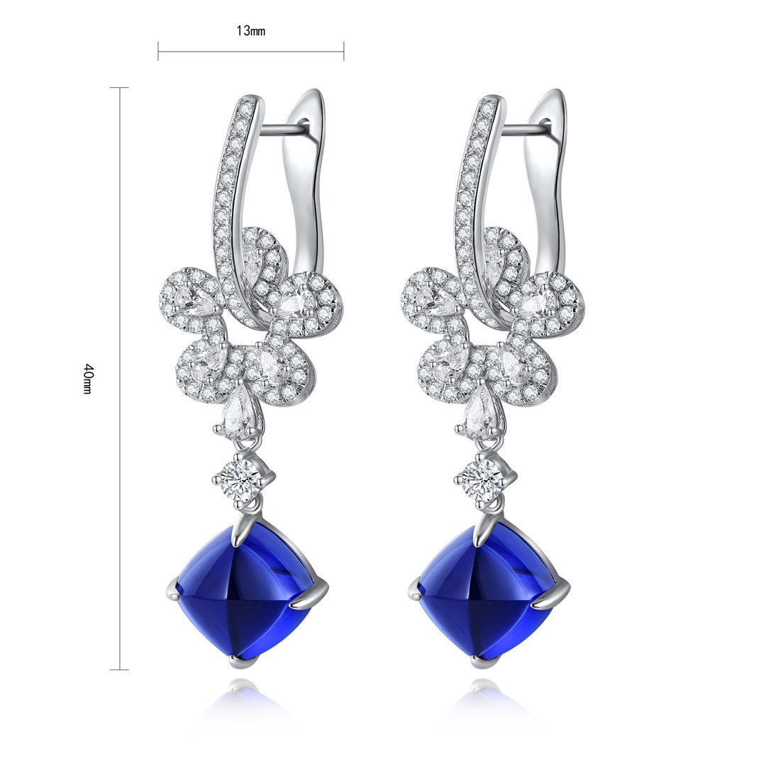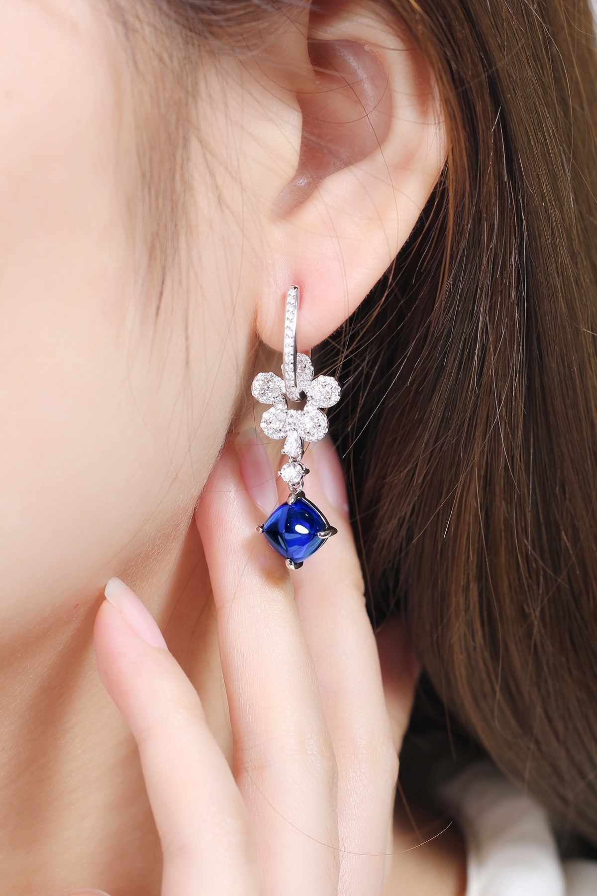 These exquisite Lab-Grown Blue Sapphire and Diamond Simulants Sterling Silver Earrings embody modern glamour infused with timeless elegance. The striking sugarloaf-cut sapphires captivate with their vivid royal blue hue and smooth, polished surface, radiating sophisticated allure. Above them, floral clusters of brilliant AAAAA cubic zirconia diamond simulants create dazzling brilliance, offering a graceful transition between the ear and the pendants. Finished in lustrous sterling silver, the design perfectly balances opulence and comfort.