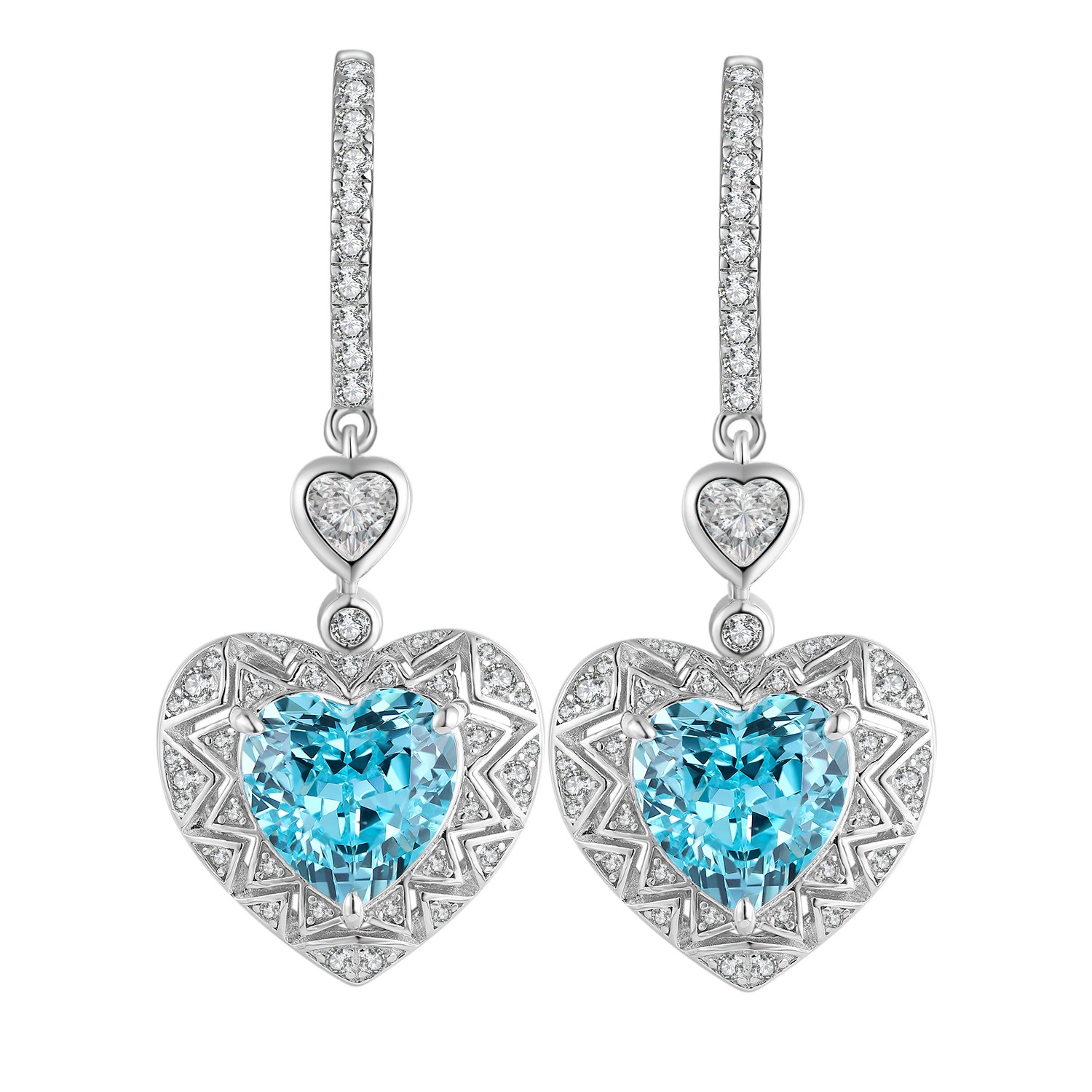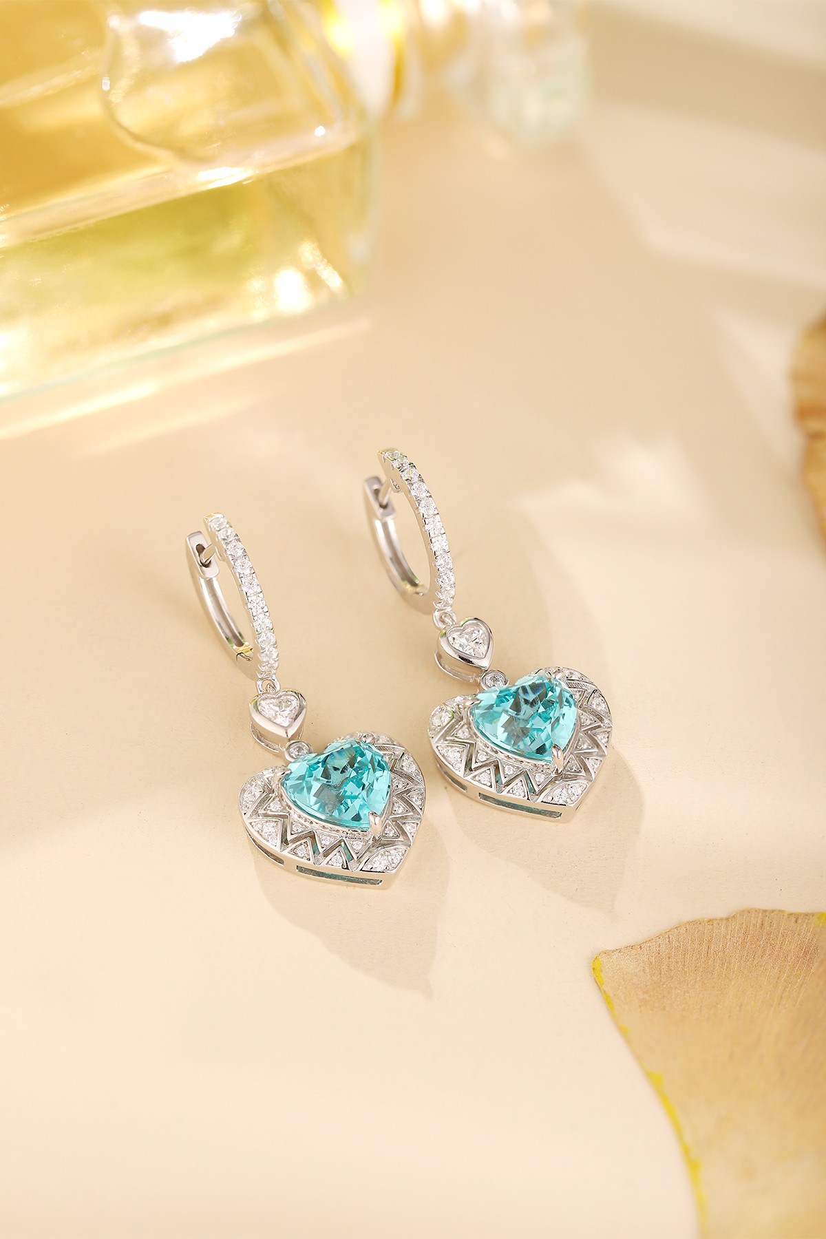 These Lab-Grown Paraiba of Diamond Simulants Gemstone Sterling Silver Earrings embody elegance and affection, designed to make hearts flutter. Each earring highlights a vivid aqua-blue heart-cut Paraiba gemstone, symbolizing love and luxury in equal measure. The centerpiece is artfully framed within a heart-shaped setting, adorned with geometric patterns and encrusted with shimmering AAAAA cubic zirconia for a dazzling finish.